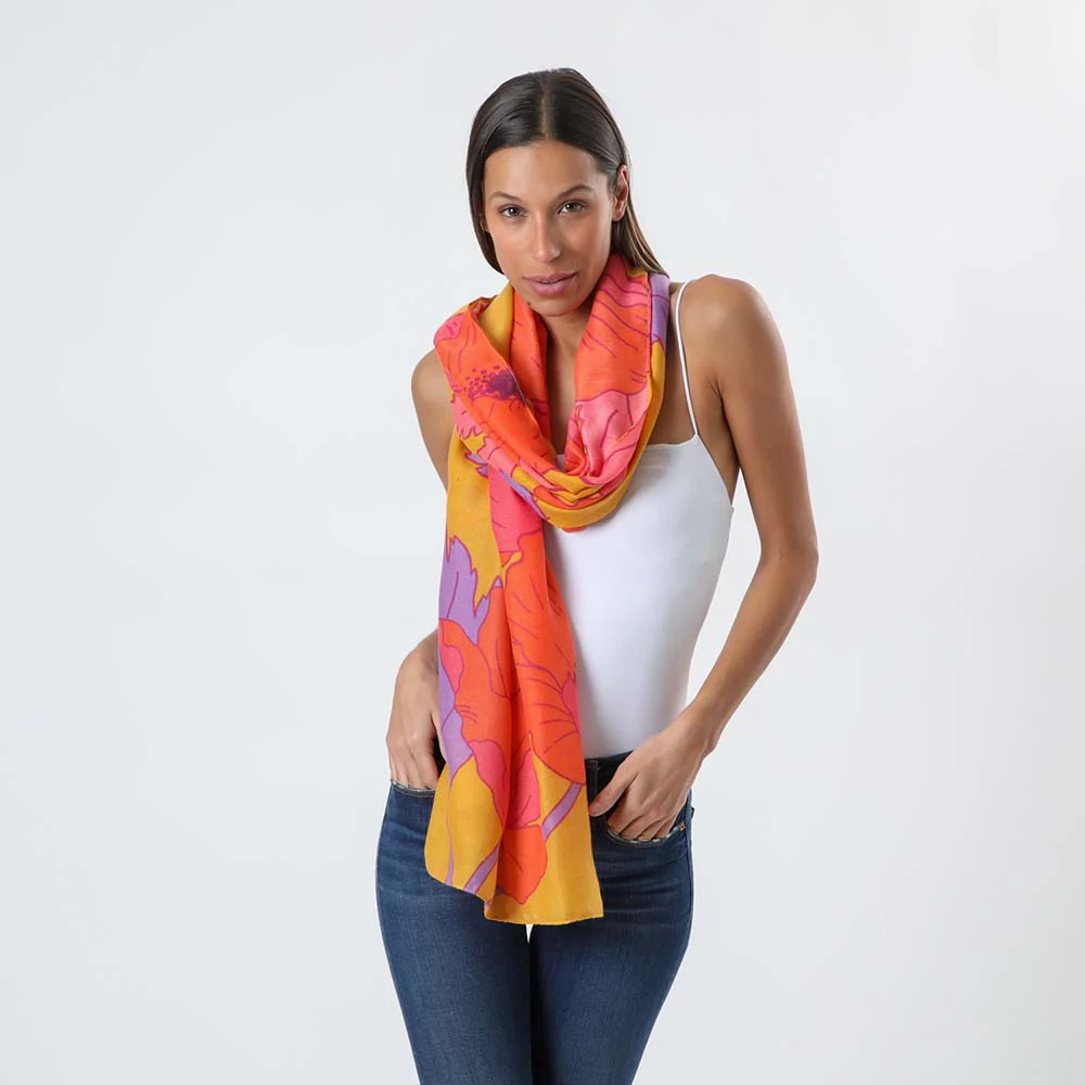 Pañuelo estampado Humana Hawai de color rosado perteneciente a la colección Pink Diamond. Su diseño son flores rosadas, naranjas y moradas en un fondo amarillo.