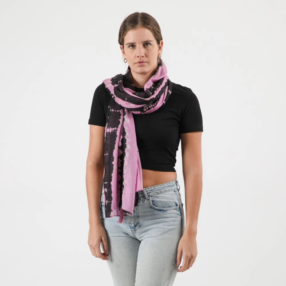 Pañuelo de algodón estampado morado con motivos de shibori color negro con terminaciones de borlas en las cuatro esquinas del pañuelo.