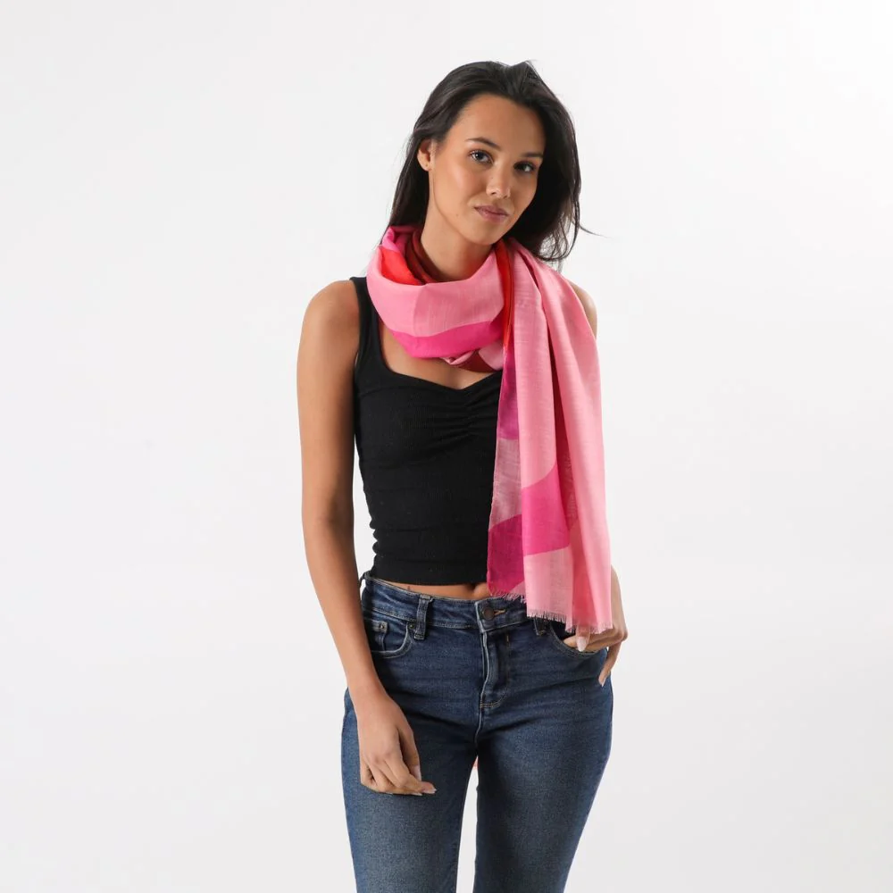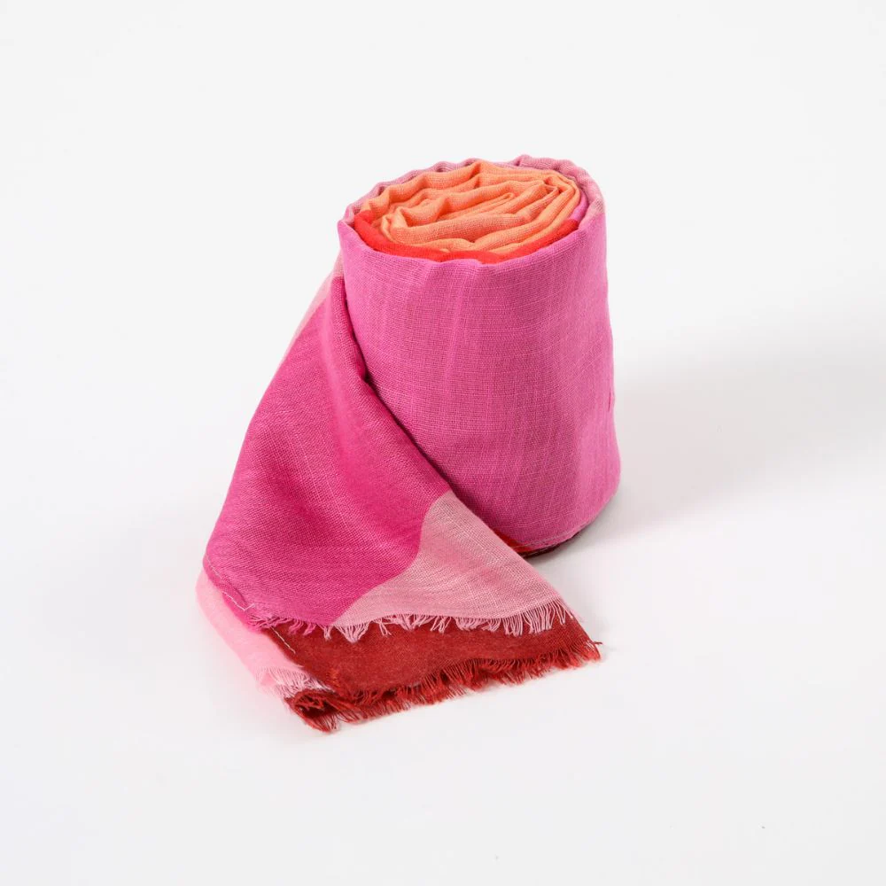 Pañuelo estampado con motivos lineales en diversas direcciones en tonos rojos, naranjos y rosados, con desflecado en sus dos extremos más cortos.