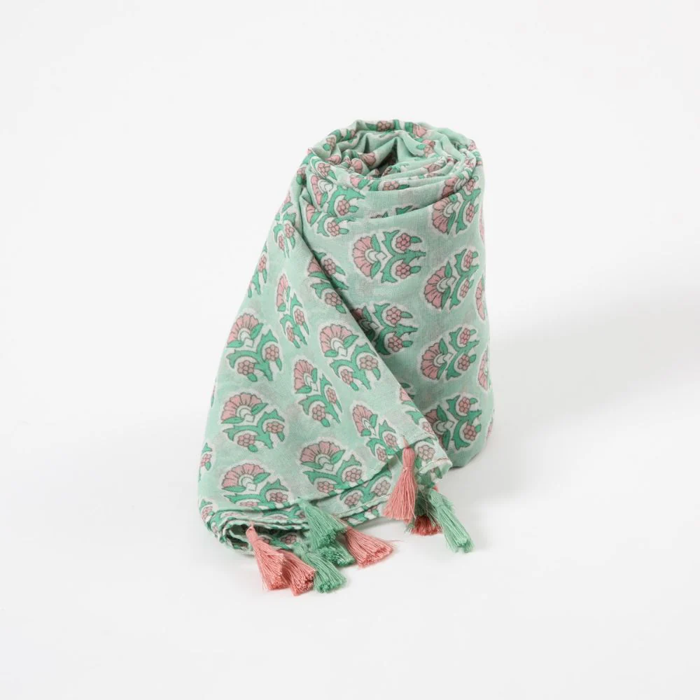 Pañuelo verde claro estampado con motivo de mosaico de flores rosadas con verde oscuro con terminaciones de borlas en los extremos más cortos del pañuelo.