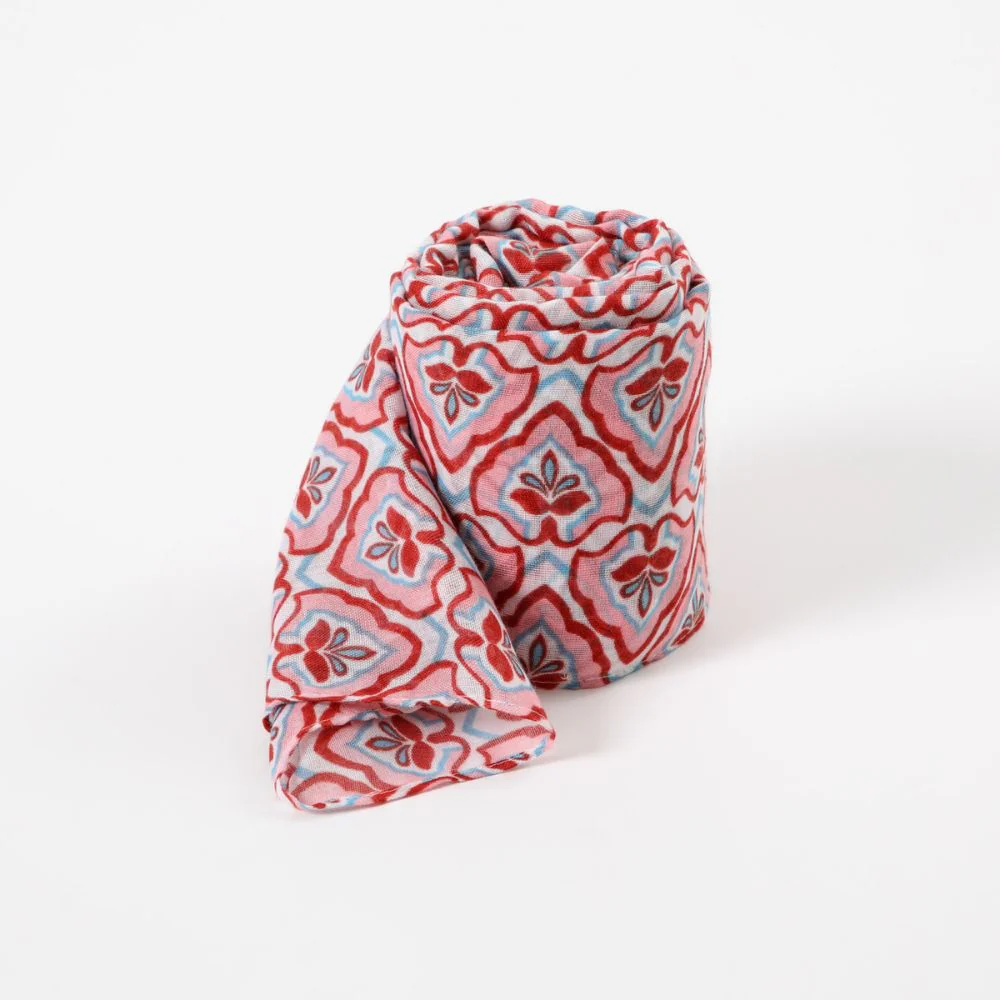 Pañuelo rosado estampado con motivo de mosaico de espigas abstractas en colores rojos, celestes y blancos sobre un fondo rosado, con terminaciones de costura lisa.