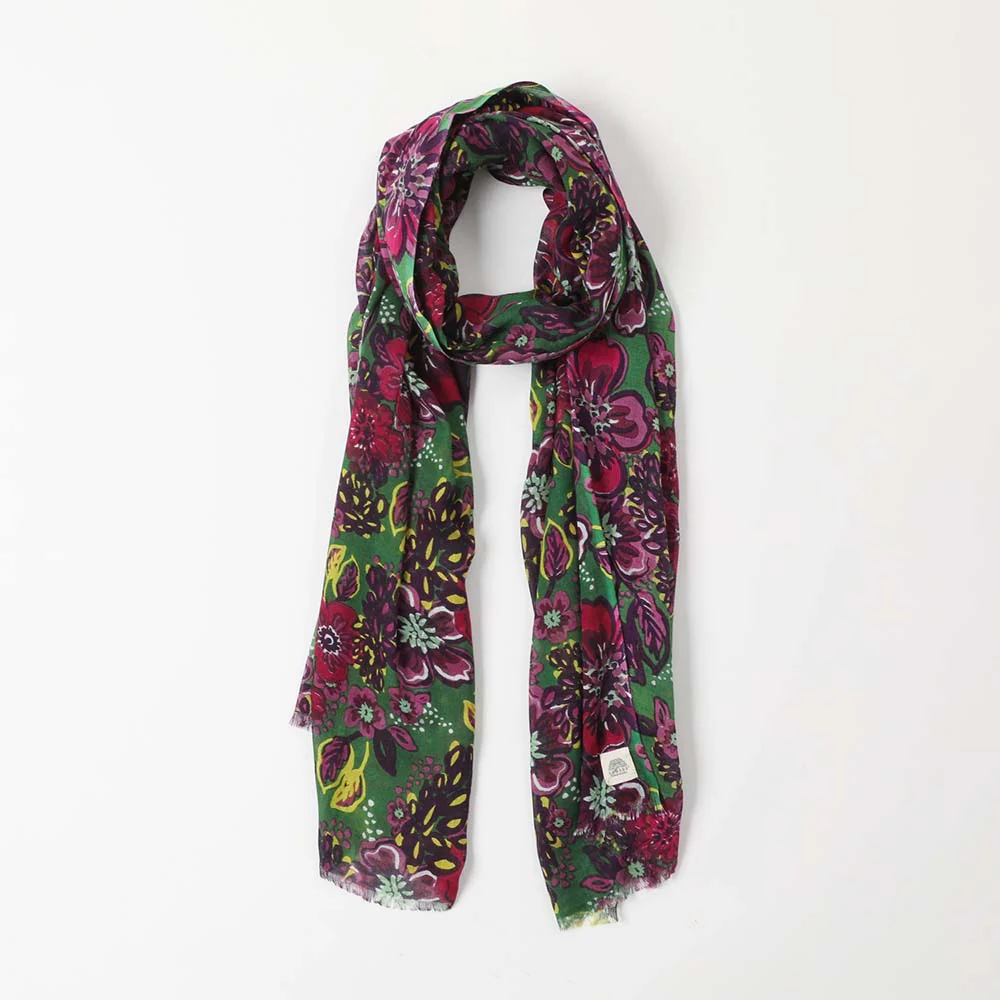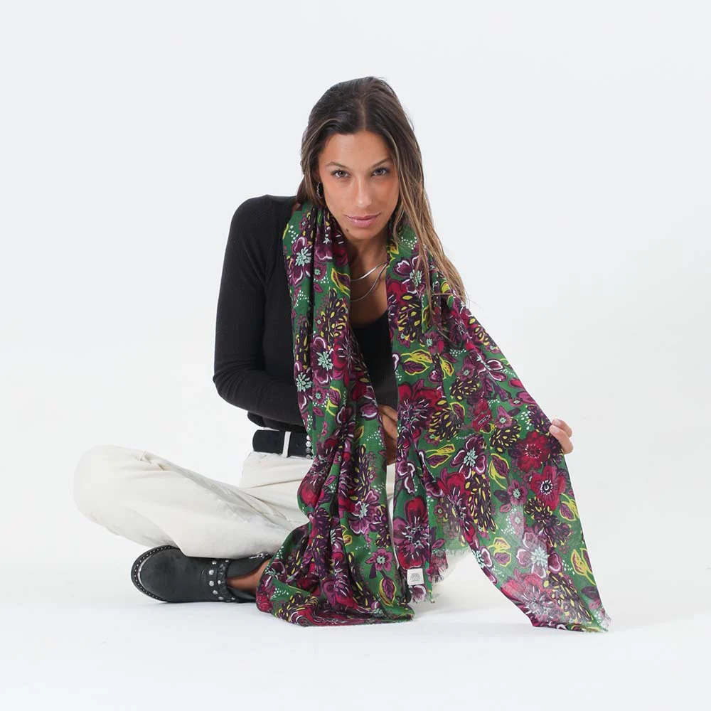Pañuelo Estampado Humana Miss de color morado perteneciente a la colección Astro Green. Diseño de flores moradas y rosadas sobre un fondo verde.
