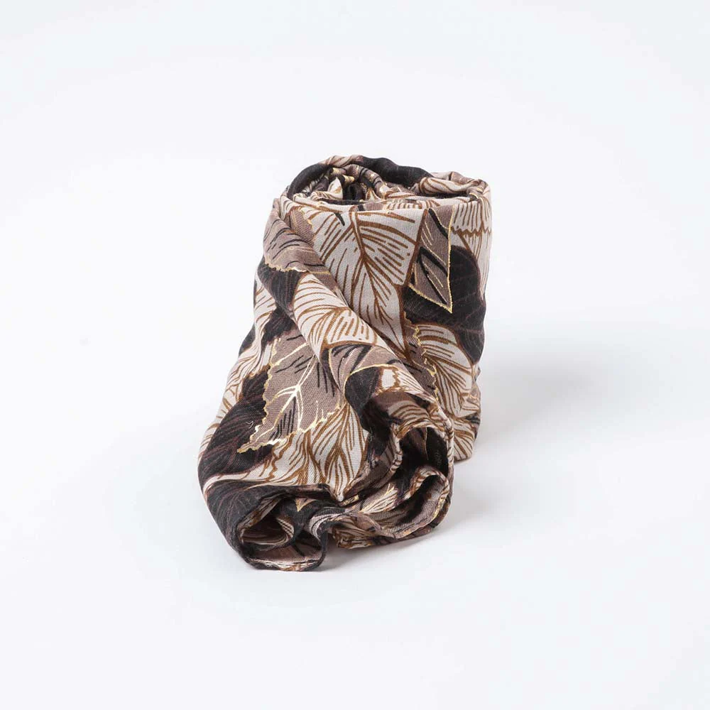 Este es un pañuelo estampado con un patrón de hojas de árbol café y beige, con detalles en folia dorada y está cosido por todos sus bordes.