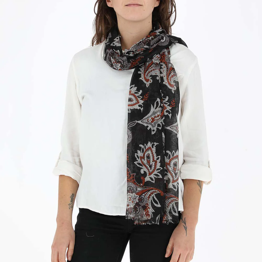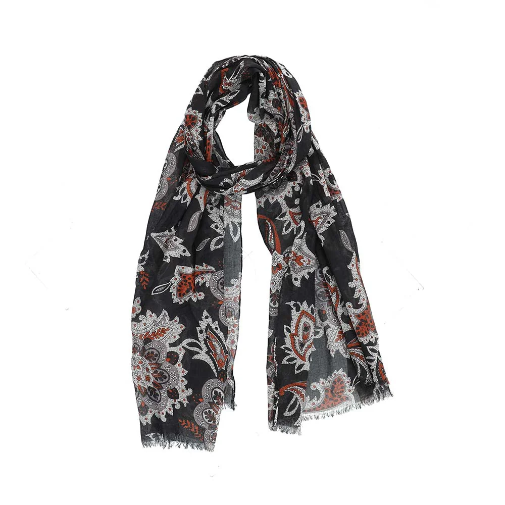 Pañuelo Humana Peisleys estampado negro que perrtenece a la coleccióm Neo Etnic. Estampado en tonos negros, cafes y grises. Terminación con flecos.
