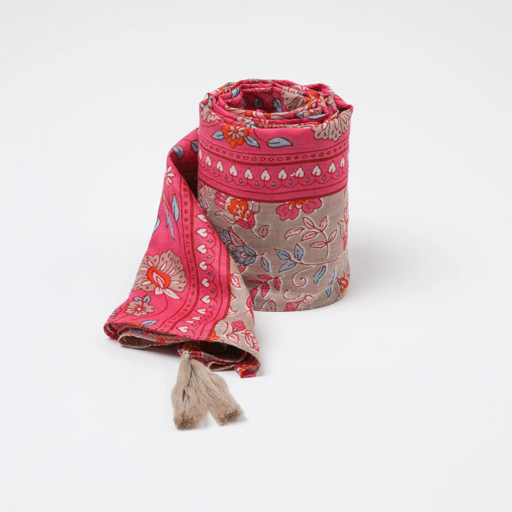 Pañuelo beige con estampado floral rosado, celeste y naranja, con terminación de borlas en las esquinas.
