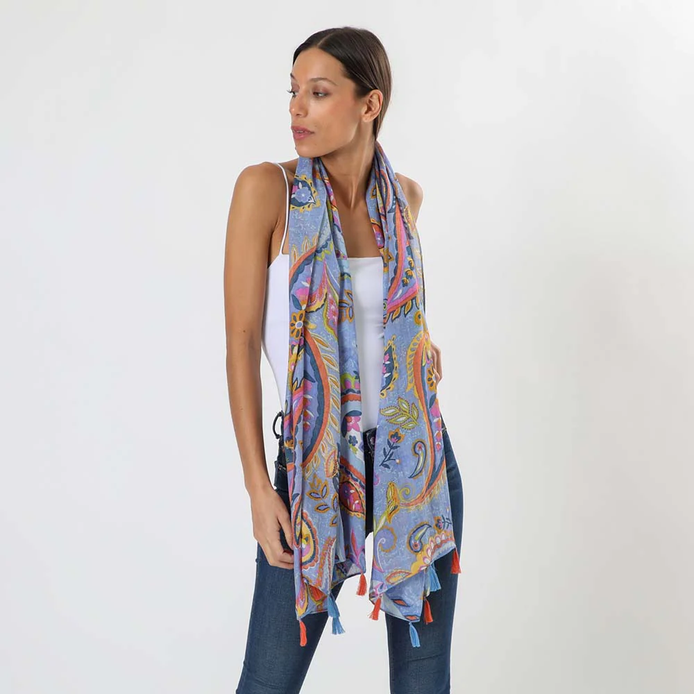 Pañuelo liso Humana Serrota de color celeste perteneciente a la colección Cornflower Blue. Su diseño está compuesto por un print en tonalidades de celeste, verde, rosado, naranjo y amarillo y borlas celestes y naranjas en cada extremo.