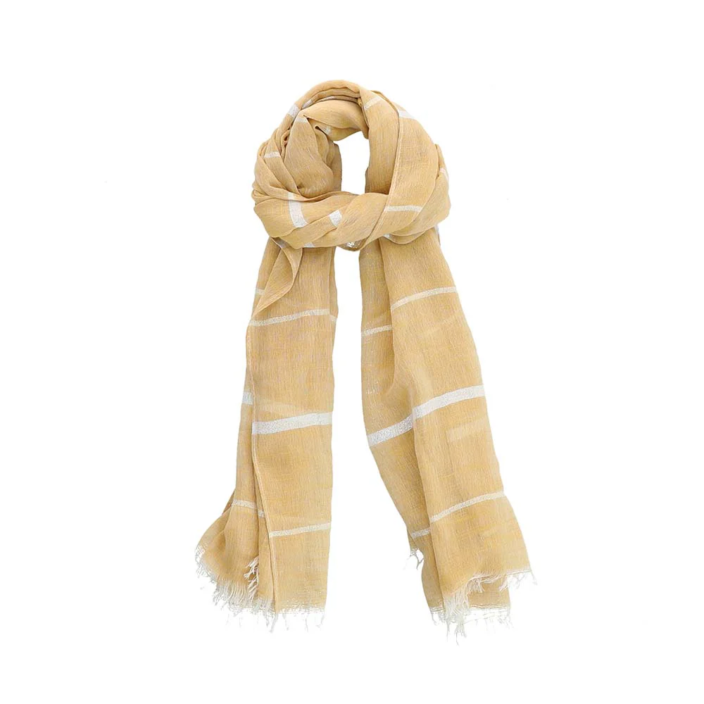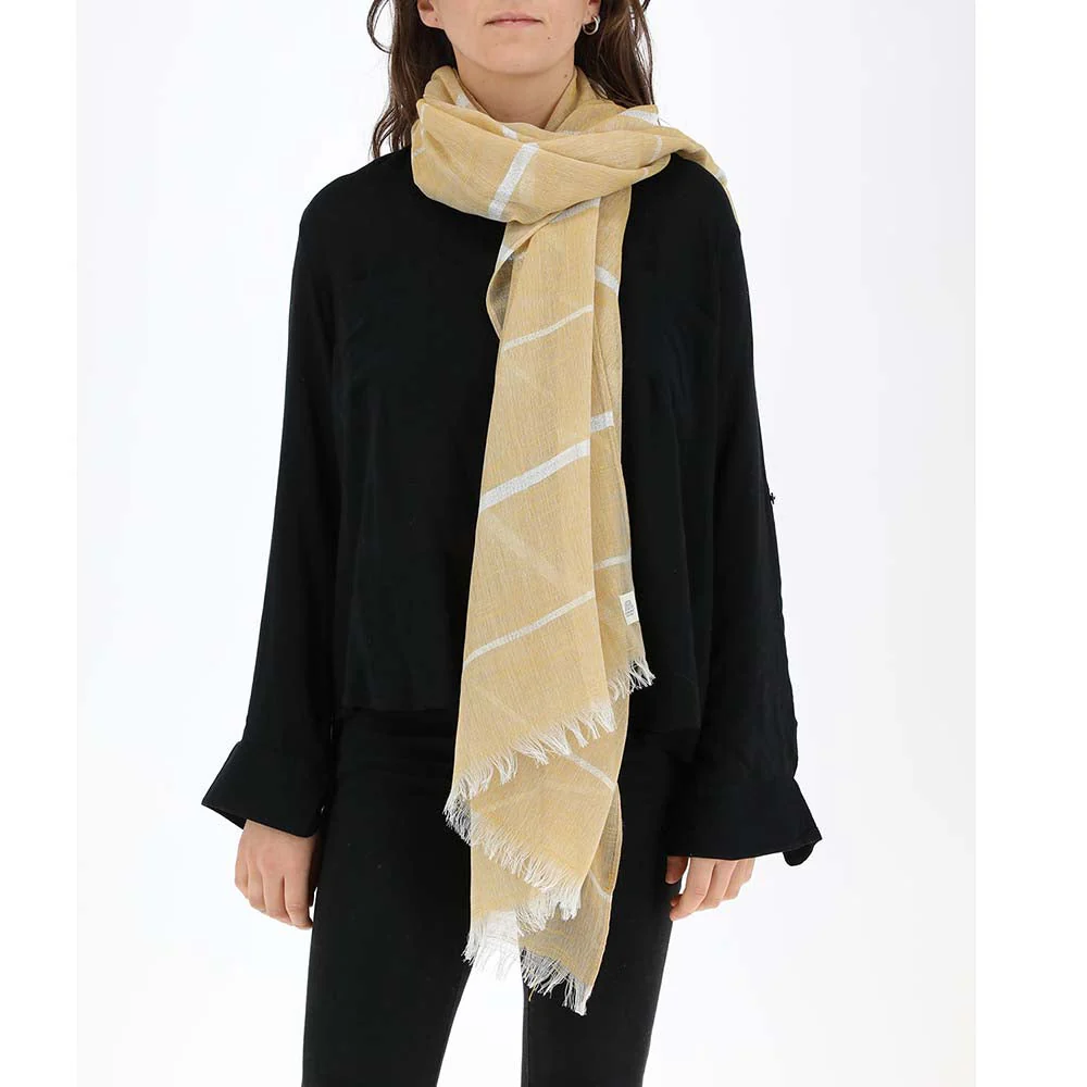 Pañuelo Humana Banana liso de color beige que pertenece a la colección Beige Macramé. Terminado en desflecado blanco de la misma tela.