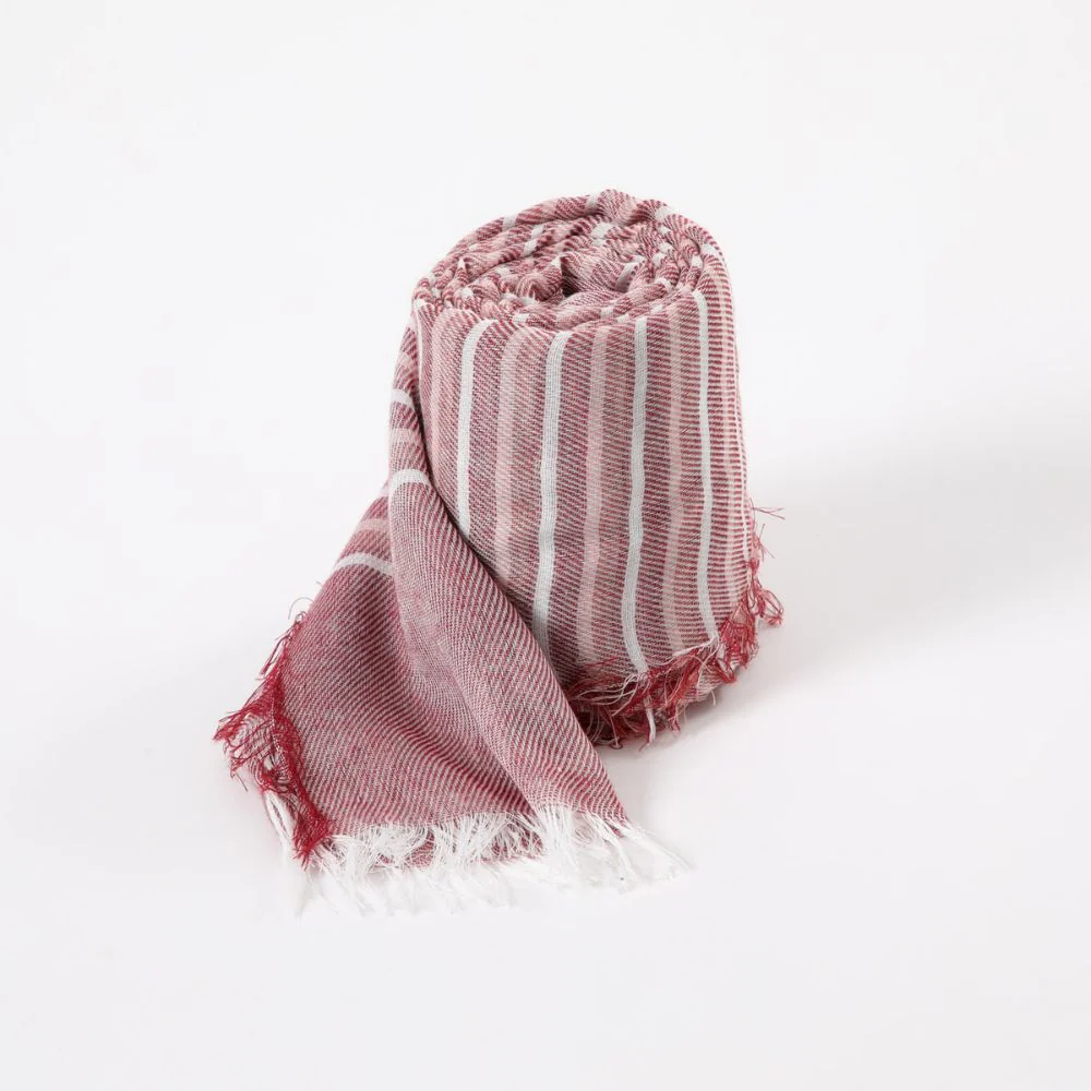 Pañuelo rojo tejido con hilos blancos y rojos generando un patrón de lineas horizontales con terminaciones desflecadas por todos los extremos del pañuelo.