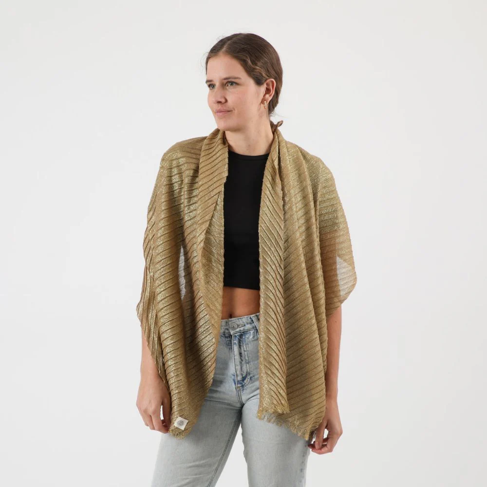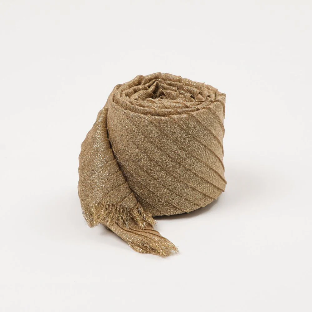 Pañuelo plizado con lineas diagonales con hilos dorados metalizados y terminaciones desflecadas a los extremos del pañuelo