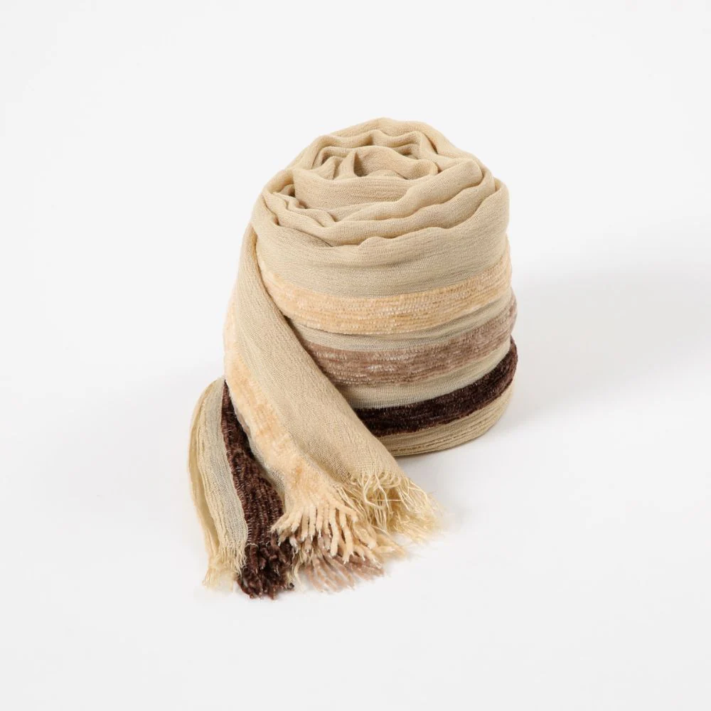 Pañuelo beige liso con rayas bordadas aterciopeladas a lo largo del pañuelo con terminaciones desflecadas en los extremos más cortos del pañuelo.