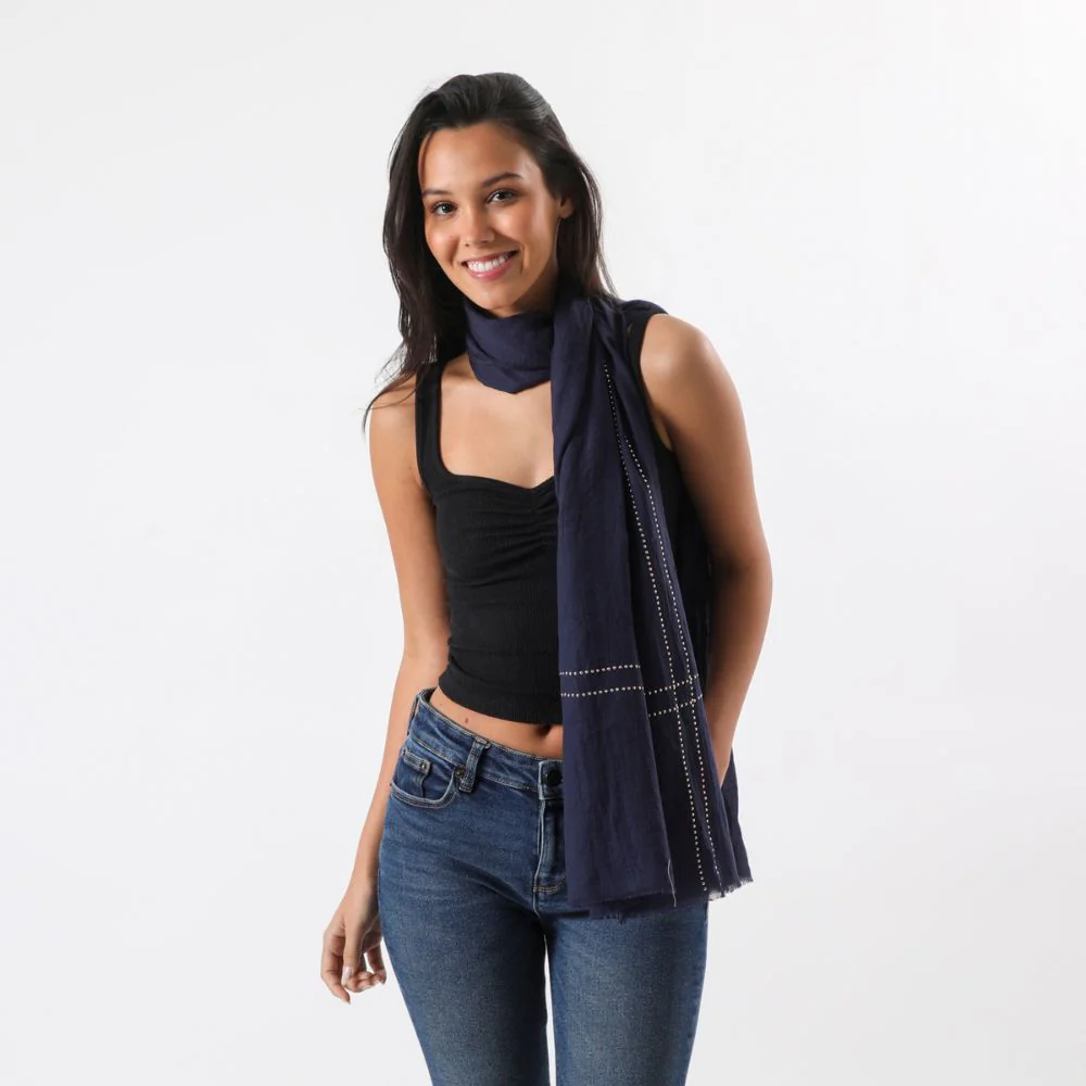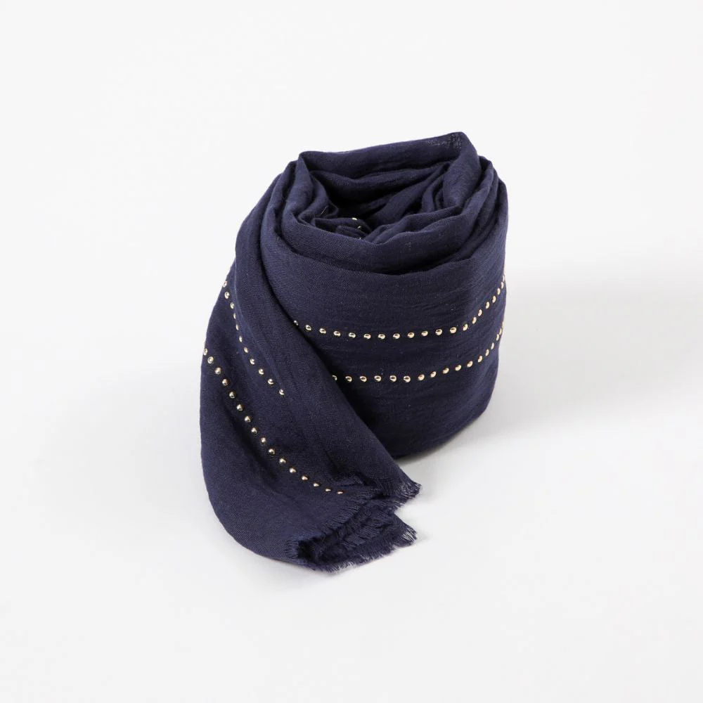 Pañuelo azul liso con incrustaciones de tachas doradas en forma de lineas horizontales al pañuelo y terminaciones desflecadas en los extremos del pañuelo