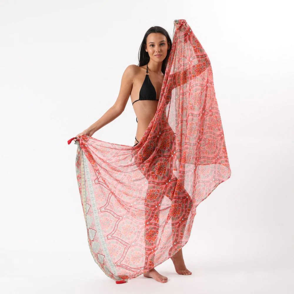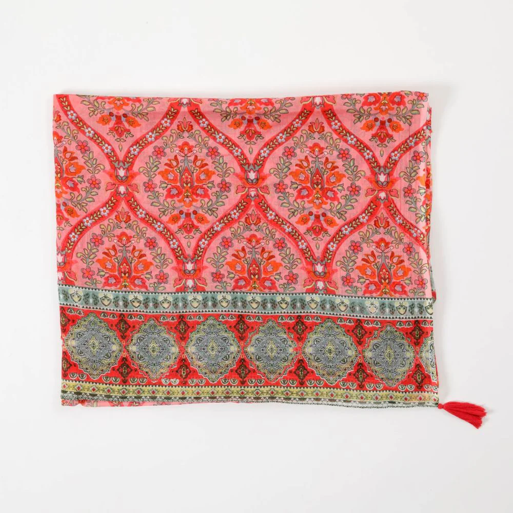 Pareo de algodón estampado con motivos rococó grandes tipo florales de colores rojos, naranjos, verdes y celestes sobre un fondo rosado con bordados sobrepuestos al diseño de color rosado con un marco estampado de un motivo rococó de rombos en tonos verdes con terminaciones de borlas en las cuatro esquinas.