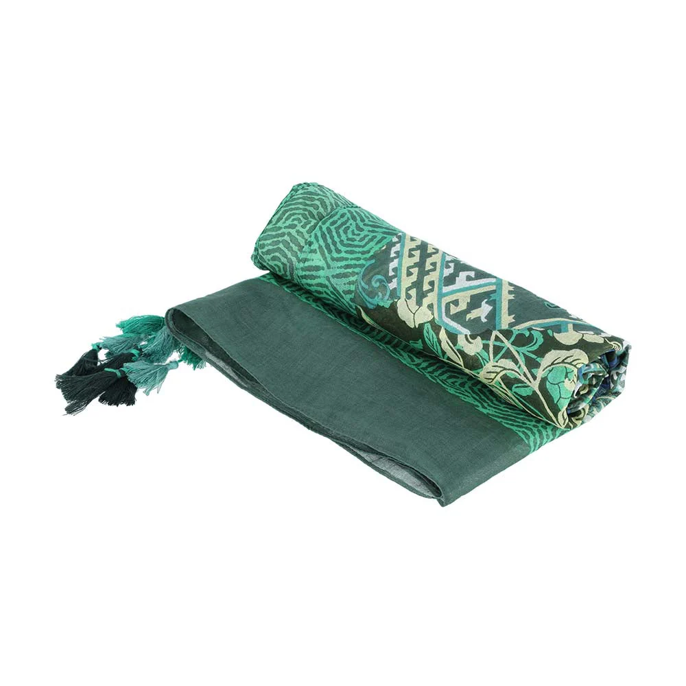 Pareo Tatienne Garden de color verde con estampado de flores y borde geométrico.