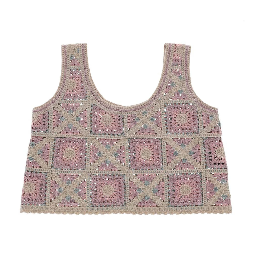 Polera Humana Beach Beige que pertenece a la colección The Crochet Collection. Tiene diseño en cuadros con toques de beige, morado, rosado y celeste.