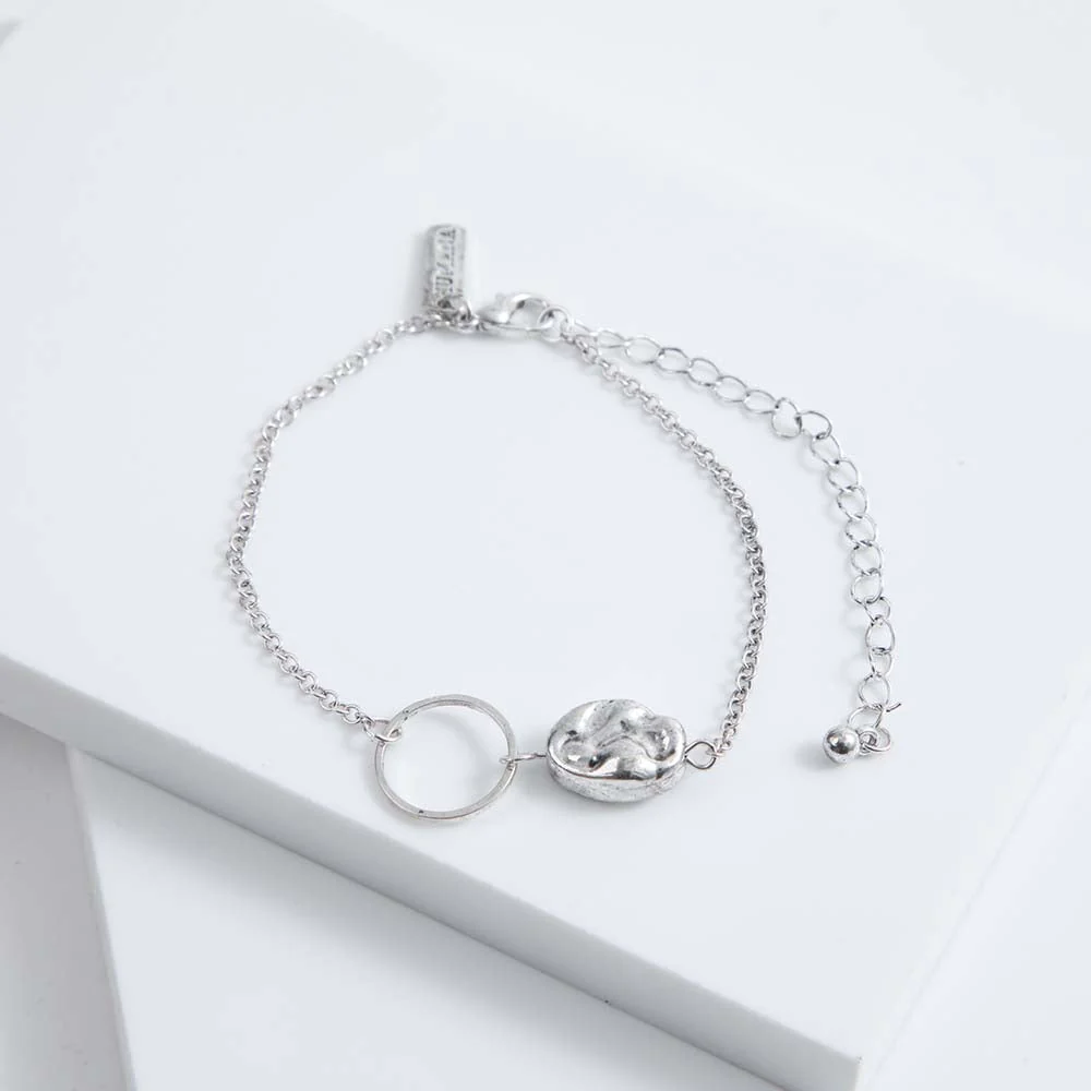 Pulsera Humana Arrecife de color plateado perteneciente a la colección Floral Nature. Esta compuesta por una cadena delgasa, un charm de forma irregular y una argolla.