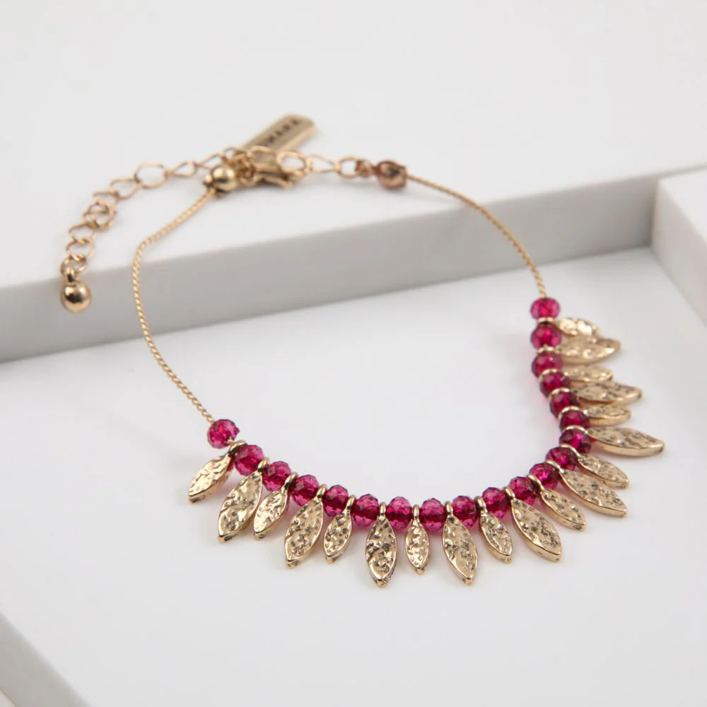 Pulsera de mostacillas semitrasparentes fucsias con hojas metálicas de dos portes intercaladas entre las mostacillas.