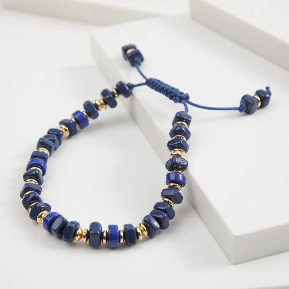 Pulsera cierre macramé con mostacillas cuadradas azules y metálicas doradas.