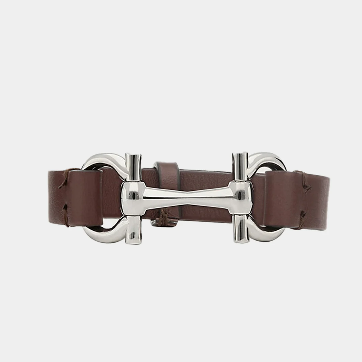 Pulsera para hombre Gancini Bit en color marrón del diseñador italiano Salvatore Ferragamo. La pulsera de cuero ajustable con un diseño de estilo Ganicni. Fabricada en cuero de becerro de color marrón oscuro y herrajes plateados.