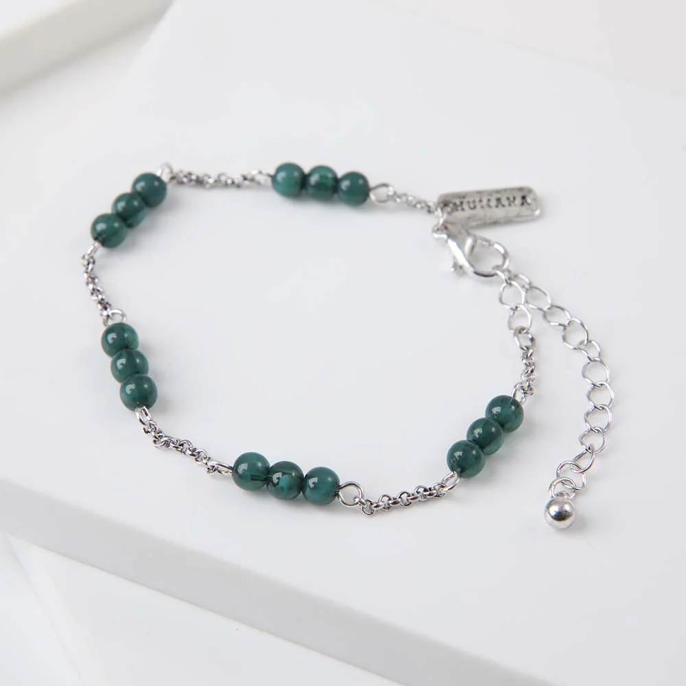 Pulsera Humana Langreo de color verde perteneciente a la colección Nephrite Green. Esta pulsera está compuesta por cadenas plateadas delgadas y mostacillas redondas verdes.