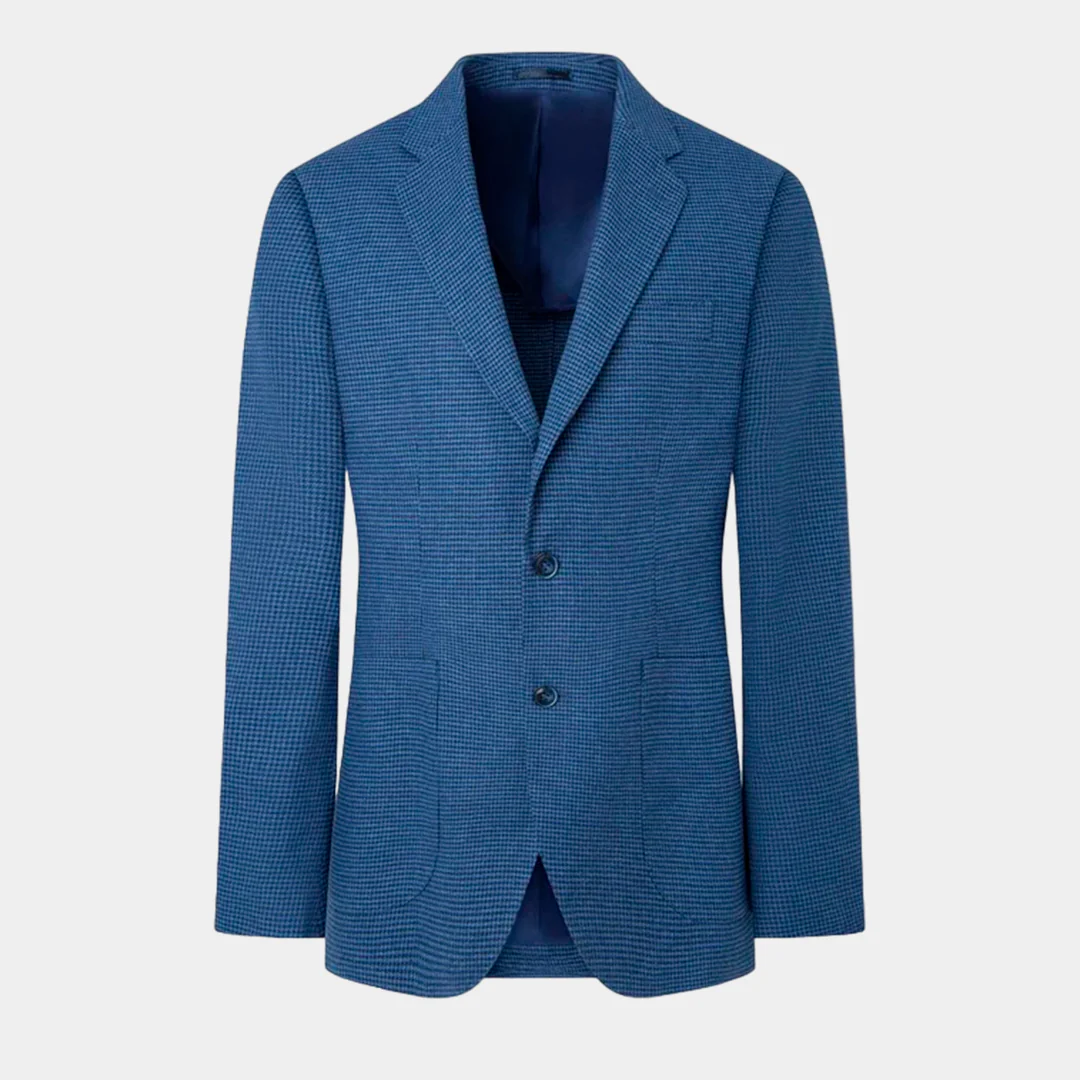 Saco Sport de Hackett London. Confeccionado en un tejido de calidad superior con una textura sutil (posiblemente un jacquard o punto de arroz) en un vibrante color azul medio que realza cualquier atuendo. Este saco de corte moderno y estructurado presenta un diseño clásico de solapa de muesca y cierre de dos botones. Su tejido lo hace cómodo y versátil, ideal para llevarlo sobre una camisa (como se muestra) o incluso una camiseta polo. Es la pieza perfecta para reuniones de negocios informales, cenas o eventos sociales donde se requiere un toque de sofisticación sin la rigidez de un traje completo.