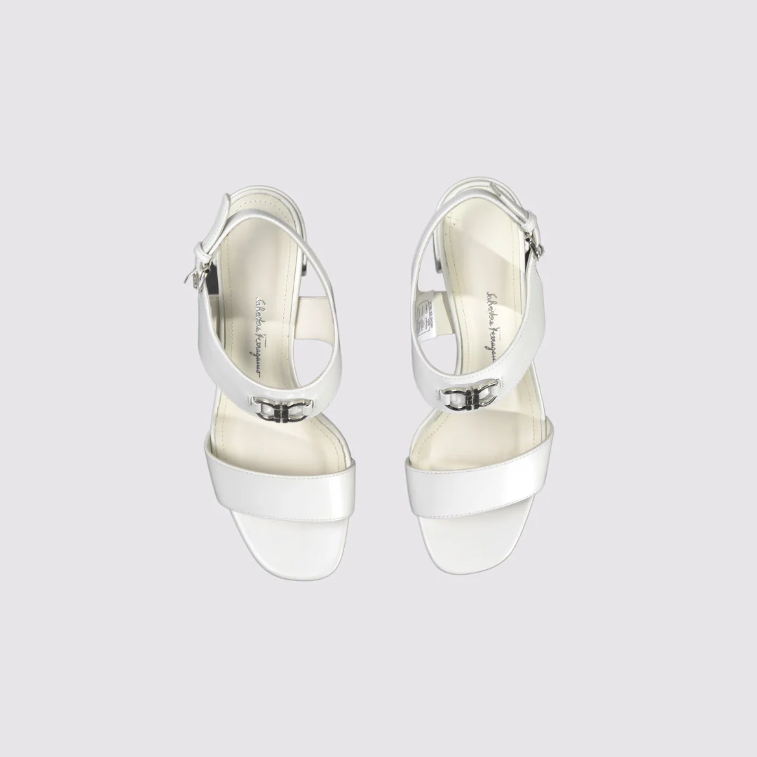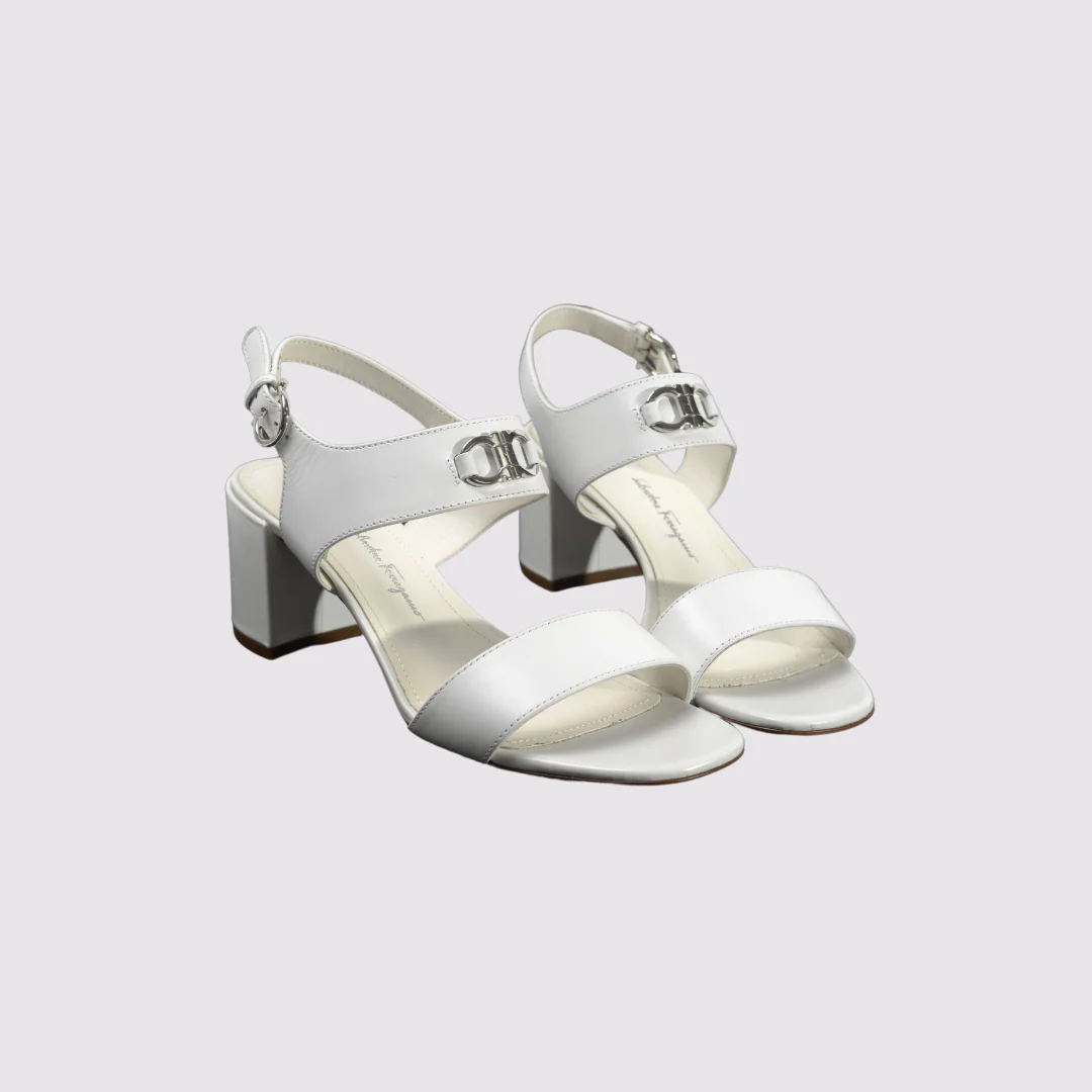 Sandalia para dama, referencia Cayla 55 de color blanco en cuero del diseñador Salvatore Ferragamo. Presentan una silueta clásica con un tacón de bloque medio. Incluyen una placa con el icónico motivo Gancini de Ferragamo, herrajes plateados y una correa ajustable en el tobillo con cierre de hebilla. Cuentan con una plantilla de cuero ligeramente acolchada para mayor comodidad.