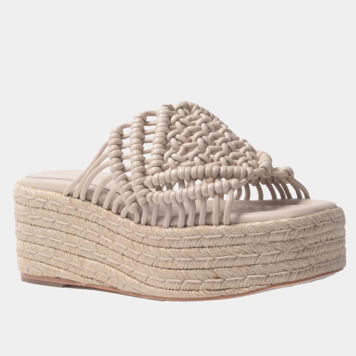 Diseño: Sandalia de plataforma con cuña, con una parte superior de nudos de cuero tejido en un patrón trenzado. La suela es de rafia trenzada.