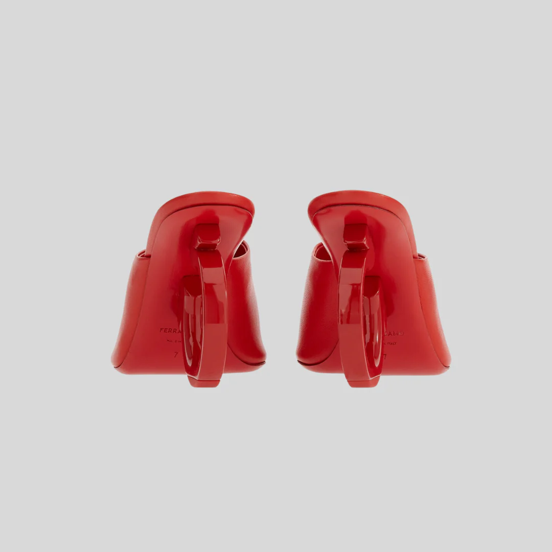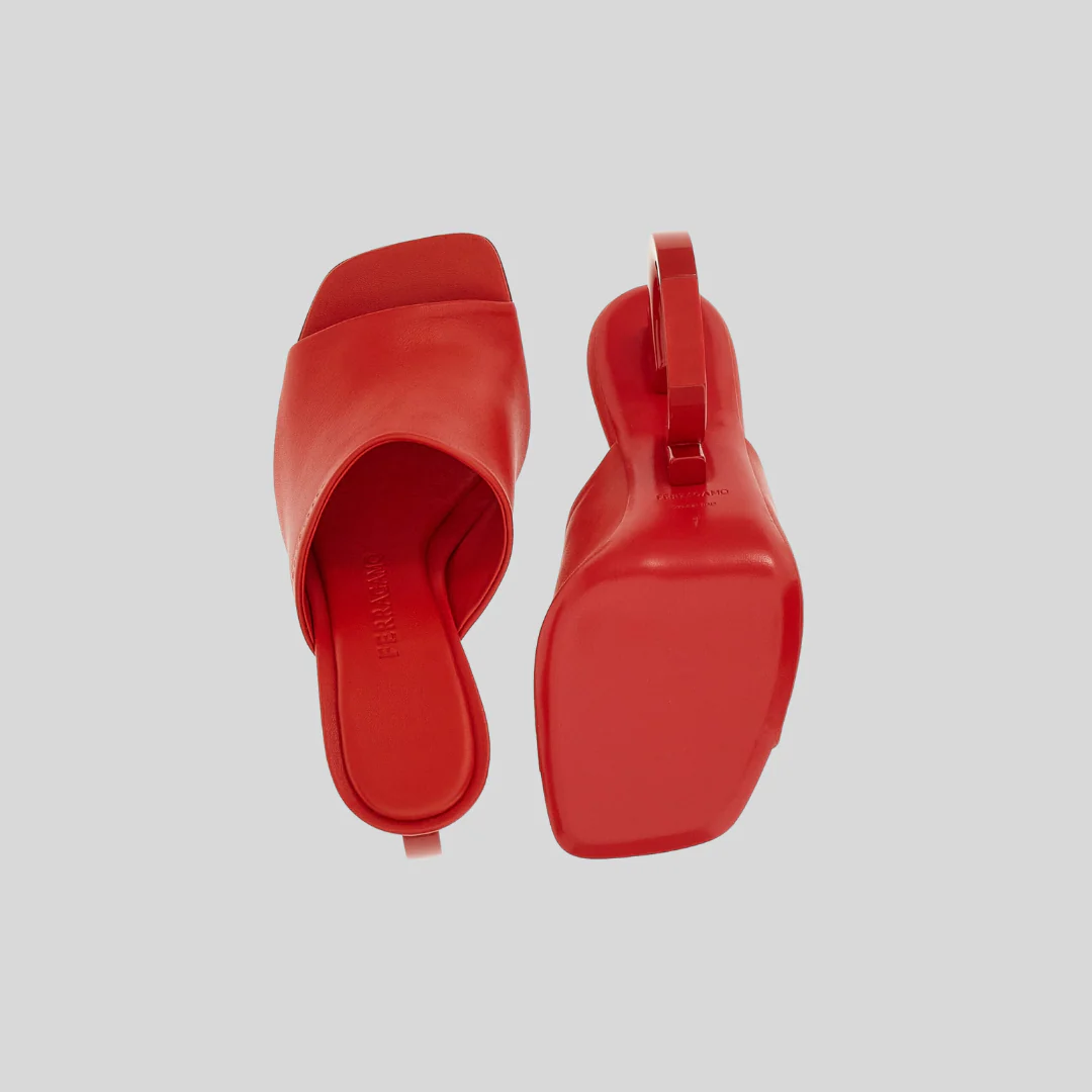 Sandalias en piel de becerro color rojo , con puntera abierta y elegante placa Gancini. Incorporan una delicada tira al tobillo con hebilla ajustable y un tacón alto que estiliza la silueta, aportando un equilibrio perfecto entre sofisticación y modernidad.