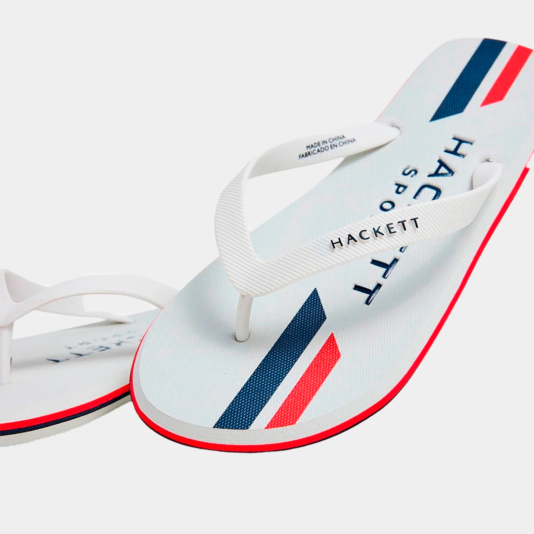 Sandalias de Dedo Hackett London. Son el accesorio esencial para cualquier destino de playa, piscina o resort, capturando un espíritu deportivo y náutico. Color Base Fresco: El cuerpo principal y las tiras están en un nítido color blanco, que maximiza la sensación de frescura y combina con todo tu vestuario de verano. Detalle Distintivo: La clave de su diseño es la triple raya lateral en azul
