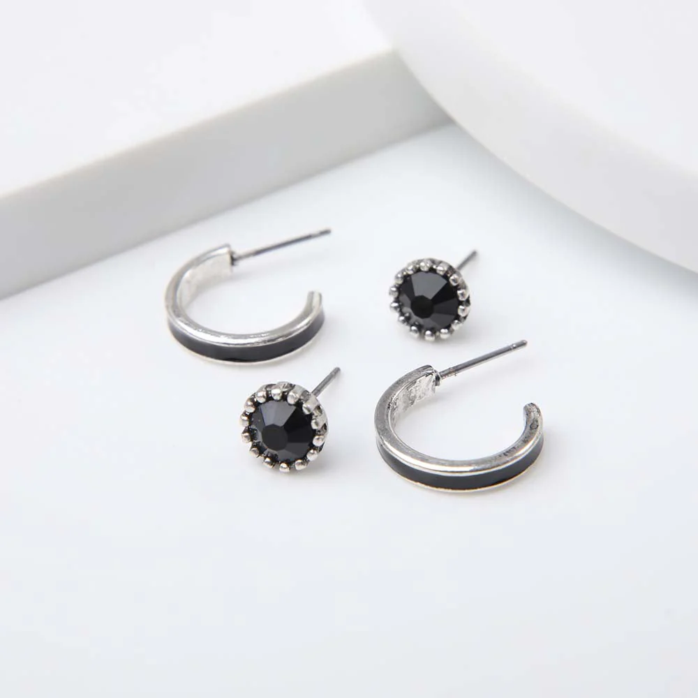 Set Aros Humana Brezo de color negro perteneciente a la colección Radiant Red. Este set cuenta con un par de aros pegados de cristal de fantasía negro redondo con borde de esferas plateadas y un par de argollas plateadas con una línea negra.