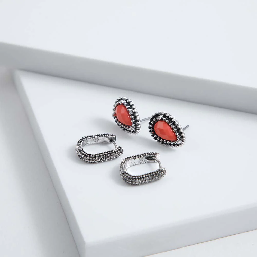 Set Aros Humana Cala de color naranjo perteneciente a la colección Floral Nature. Este set cuenta con aros pegados en forma de gota naranjos con borde de pelotas pequeñas de color plateado y argollas rectangulares texturadas de color plateado.