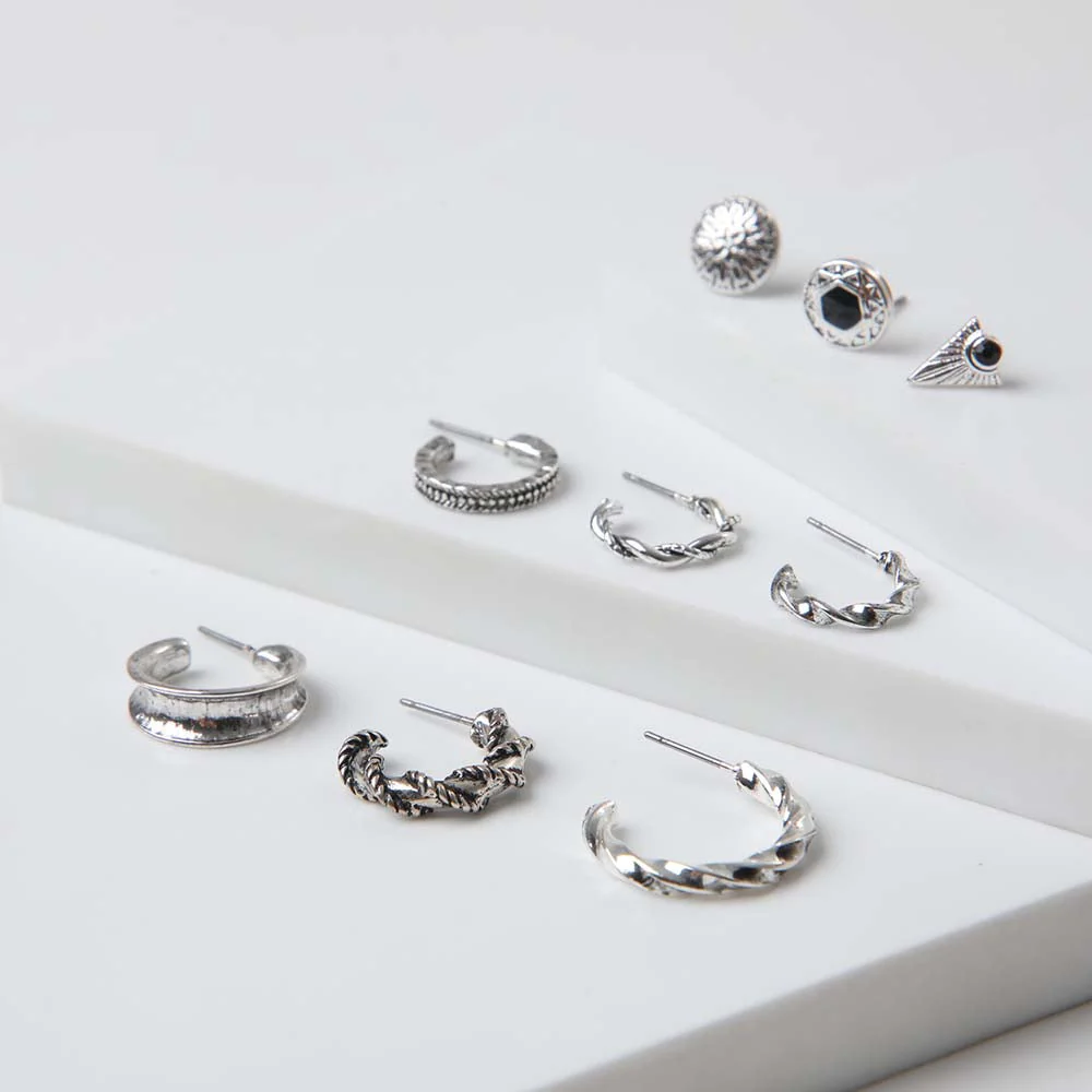 Set de 9 aros dorados. Están inspirados en el mundo más boho, con figuras talladas y detalles trenzados