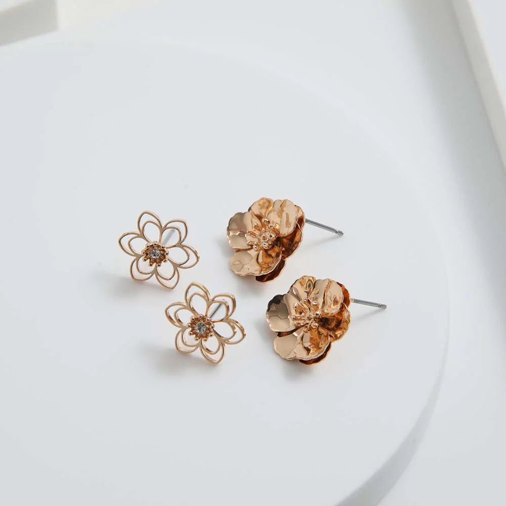 Set Aros i-D Lifandi de color dorado. Este set está compuesto por dos pares de aros pegados con forma de flor, uno de ellos con un brillante al centro.