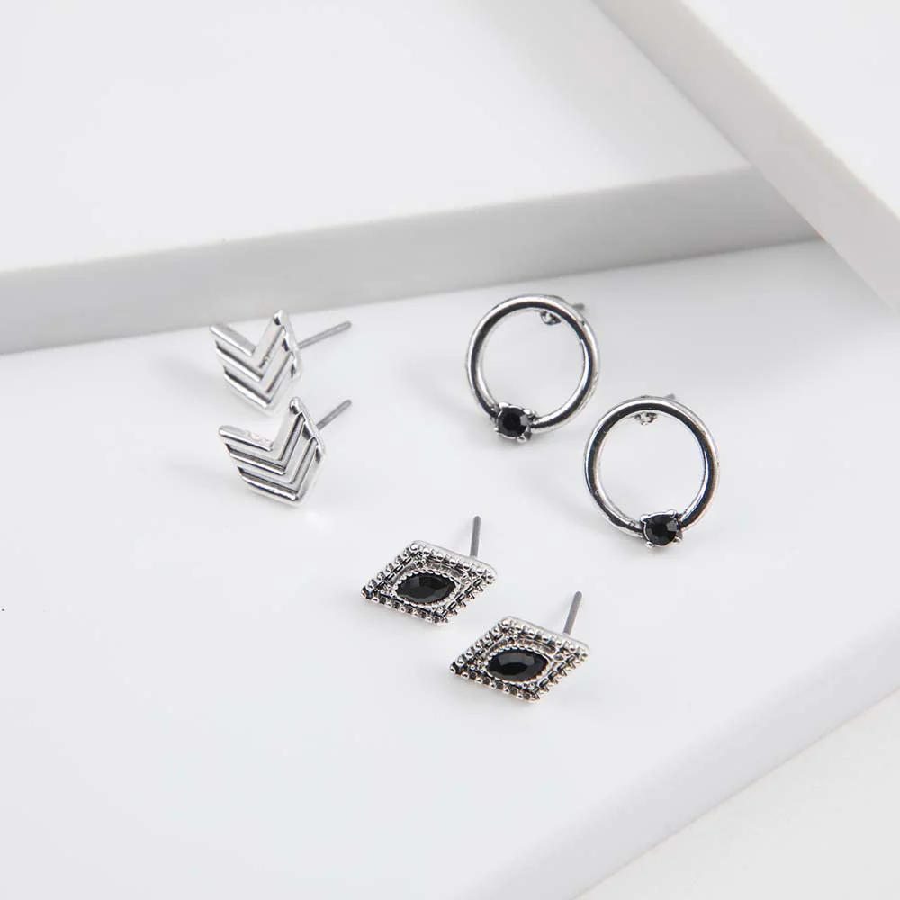 Set Aros Tatienne Lyon de color negro. Este set cuenta con un par de aros pegados plateados con forma de punta de flecha, un par de aros pegados con forma de rombro plateado texturado con un rombo negro en el centro y un par de aros pegados redondos con u