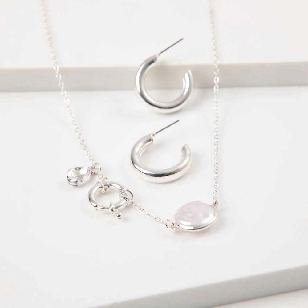 Set de argollas medianas gruesas con collar de cadena con broche circular, dije pequeño de gota con brillante de fantasía blanco y con detallle de círculo blanco con terminación nacarada.