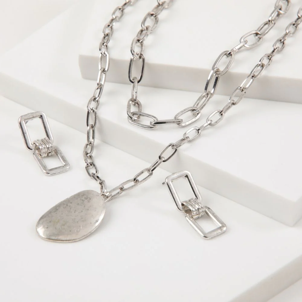 Set de collar de doble capa plateado de cadena gruesa con un broche de forma abstracta con un par de aros en forma de cadena plana.