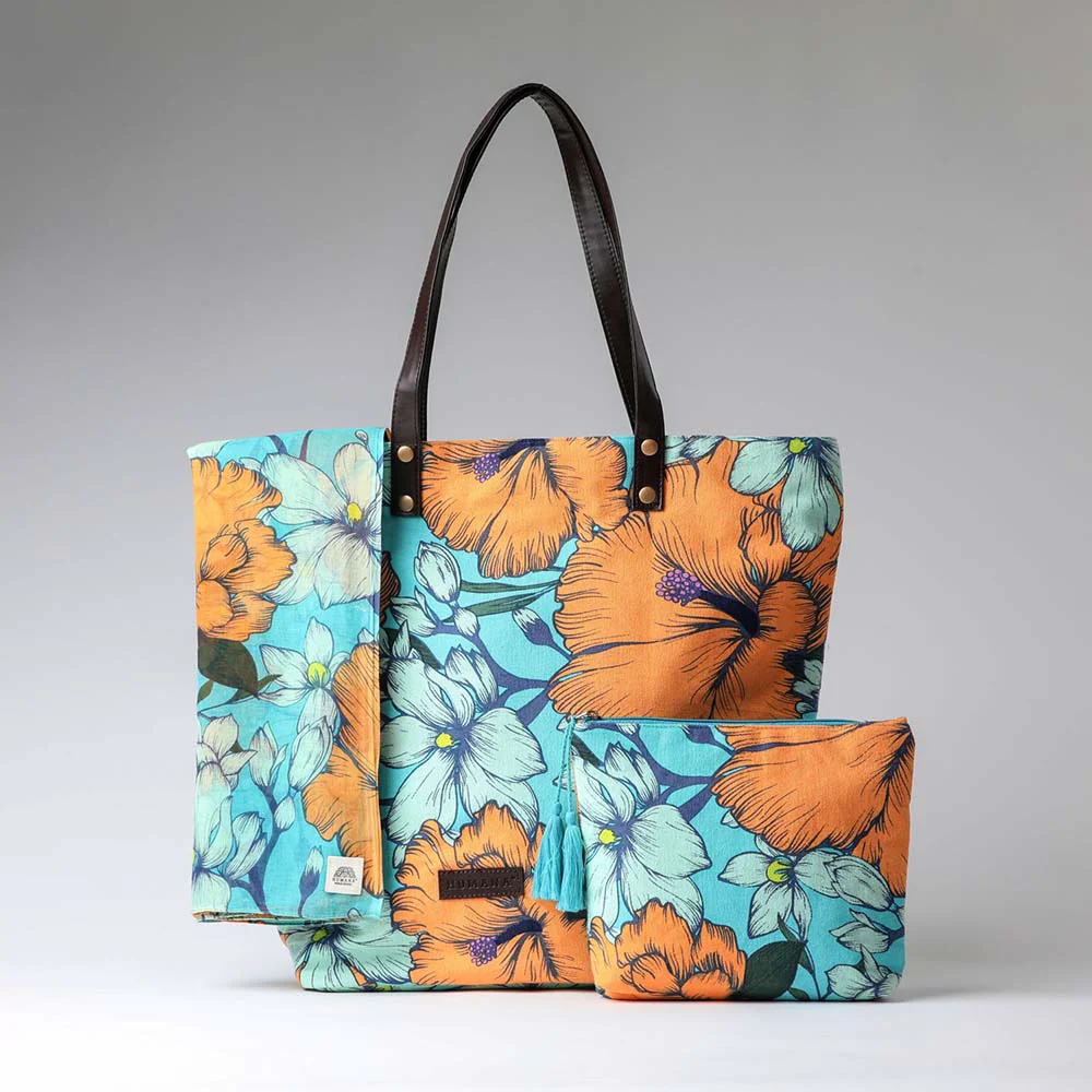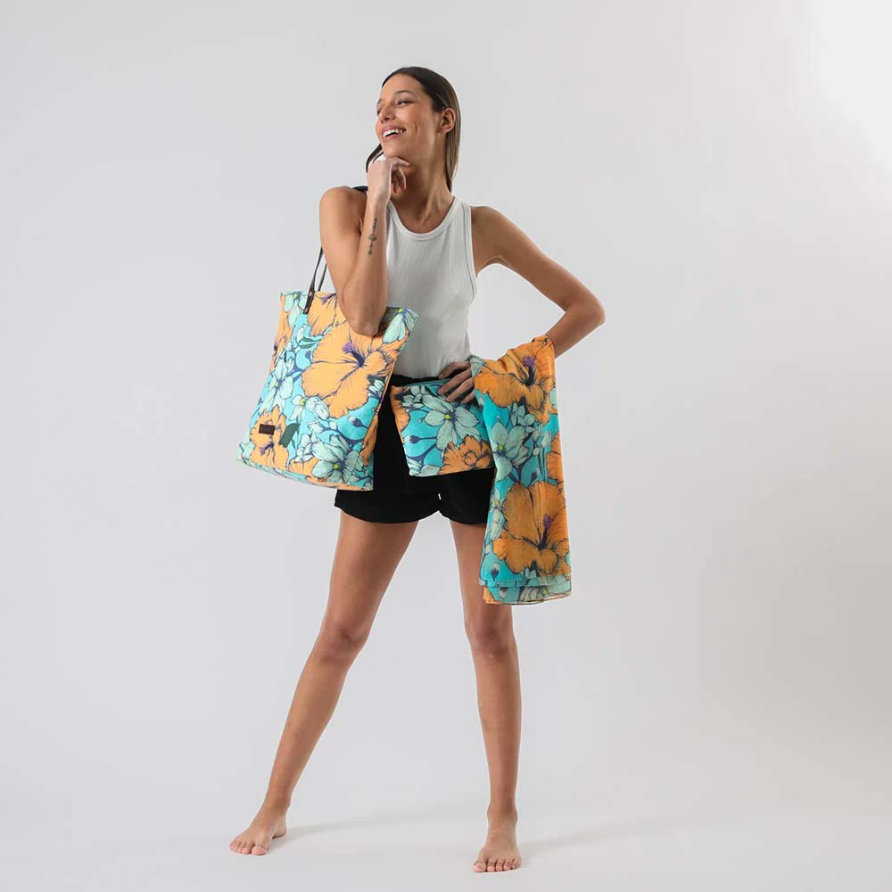 Set Playa Humana Floral de color celeste. Este set incluye un una cartera de hombro, un estuche cosmetiquero y un pareo, todos con estampado floral en tonos celestes y naranjo.