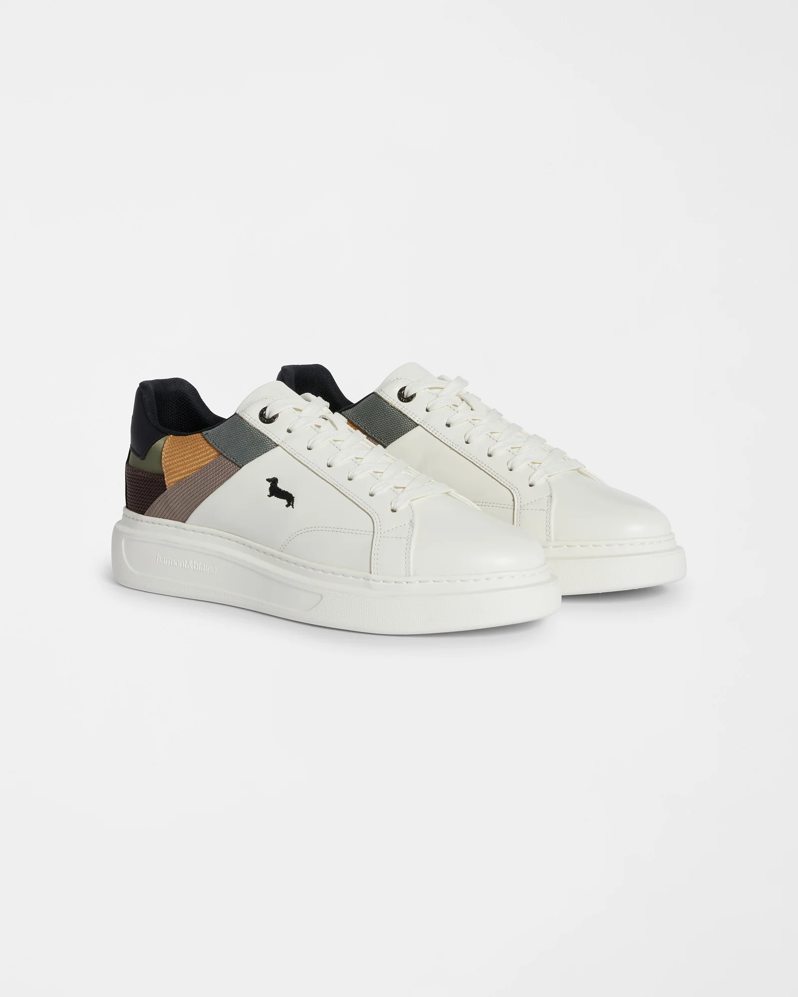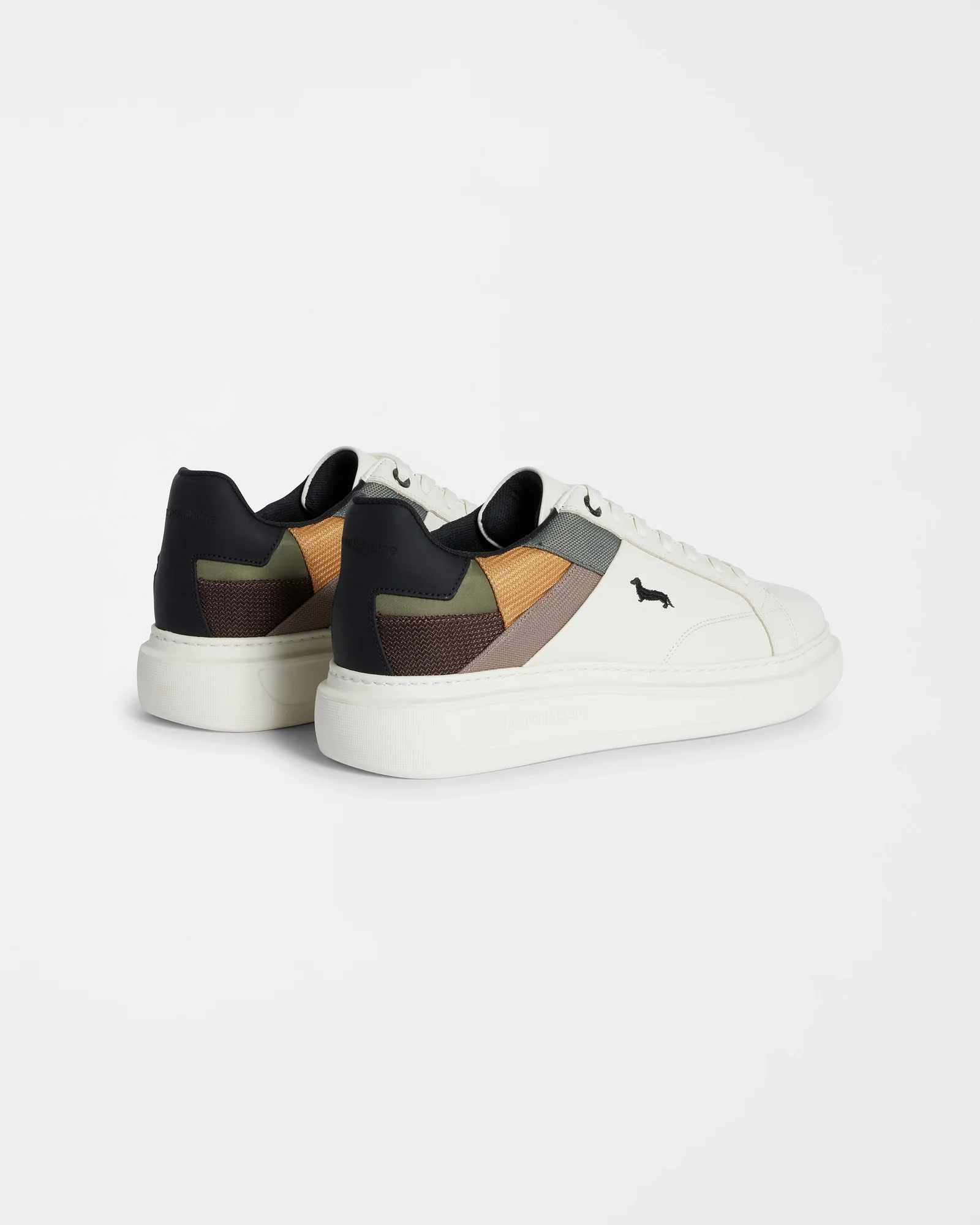 Presenta una parte superior de piel adornada con una mezcla de diferentes tejidos para crear un efecto de patchwork. La suela es de EVA ligera, con un grosor de 4,5 cm, lo que proporciona comodidad y practicidad. La zapatilla tiene un aspecto dinámico y moderno gracias a los colores brillantes y los tejidos variados, mientras que la parte superior mantiene líneas básicas y minimalistas. También cuenta con el bordado del icónico perro salchicha de la marca en el lateral exterior.