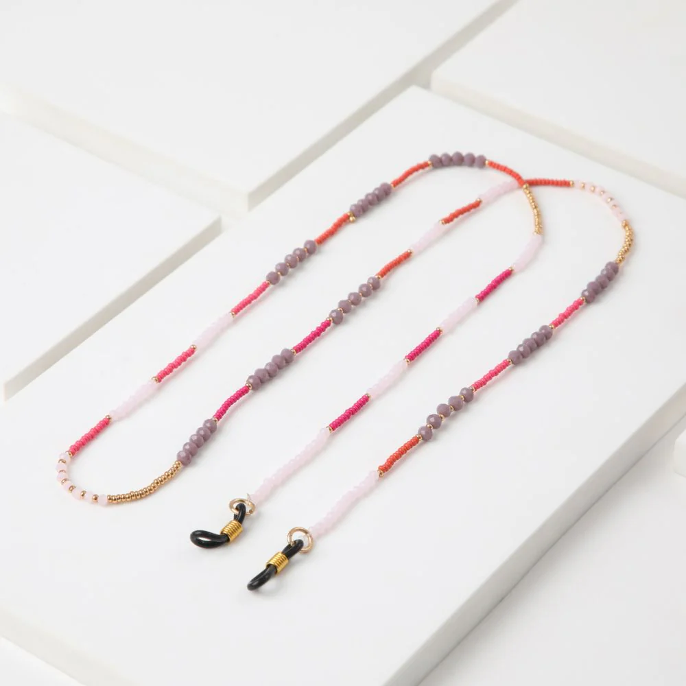 Strap porta-anteojos compuesto por grupos de mostacillas moradas, rosadas, naranjas, lilas y doradas.