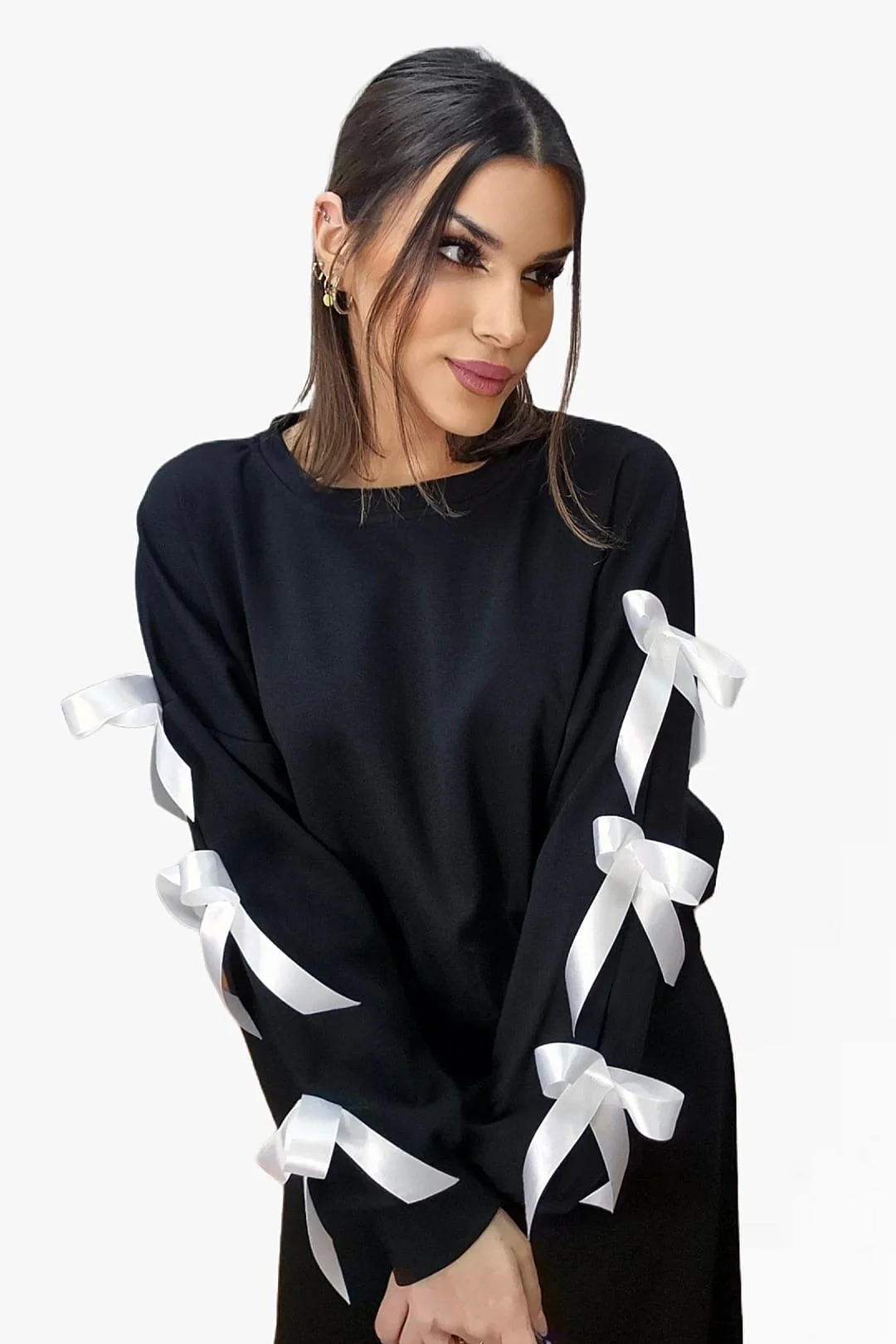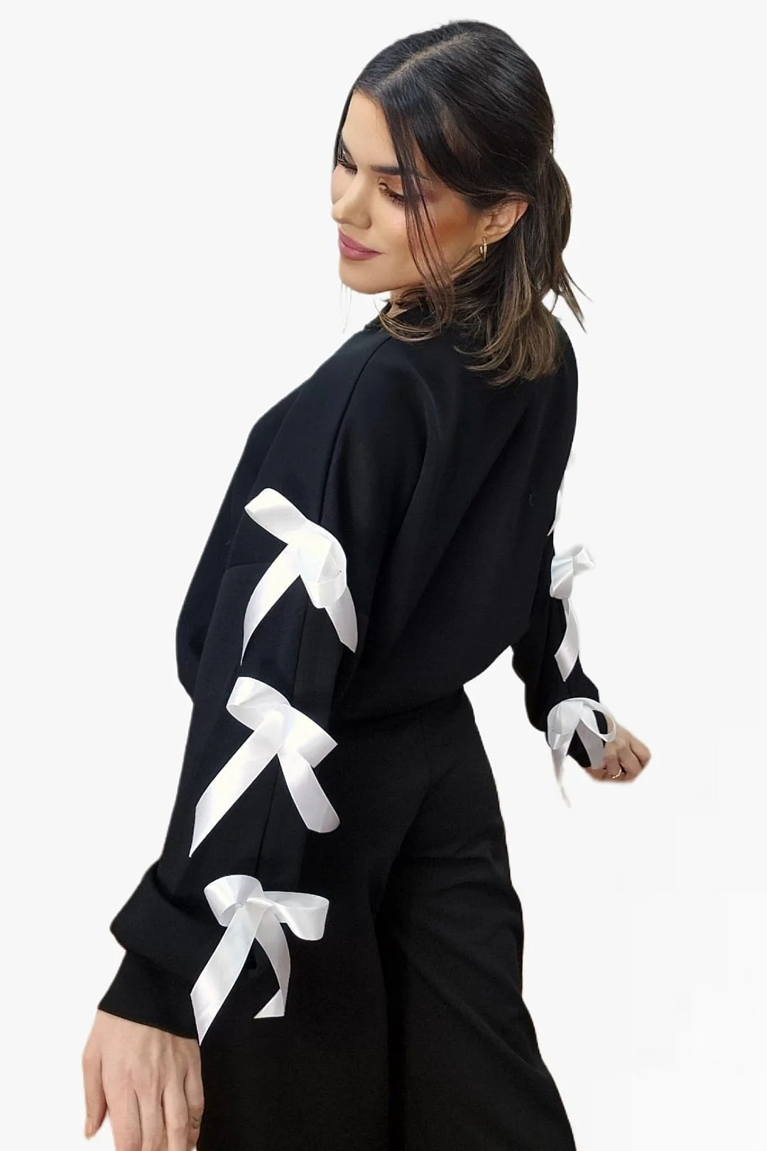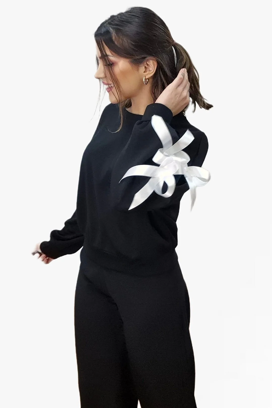 Sudadera cuello redondo con lazos en mangas.