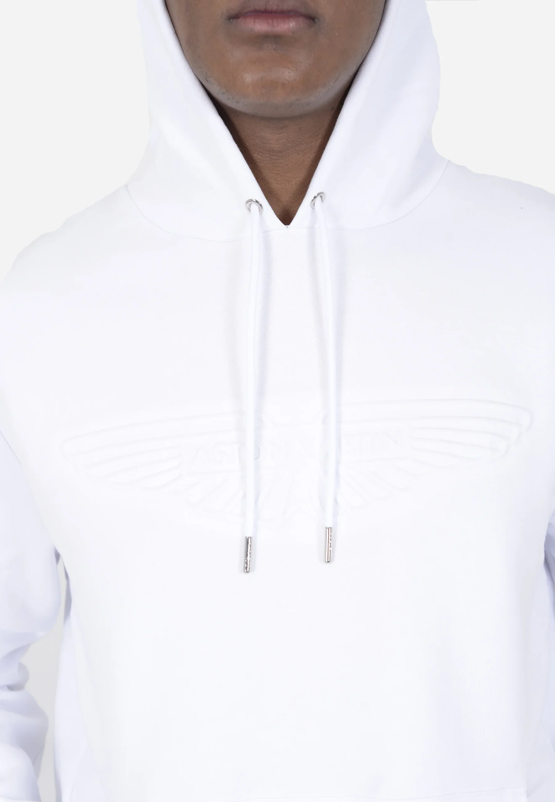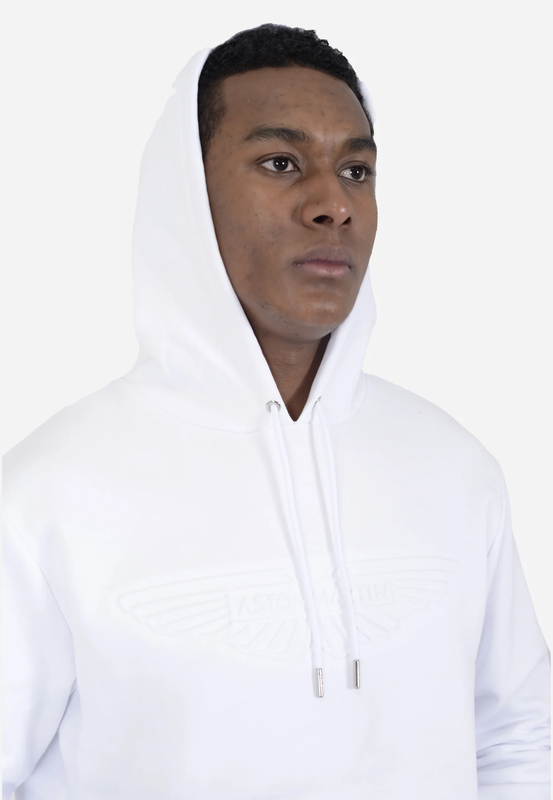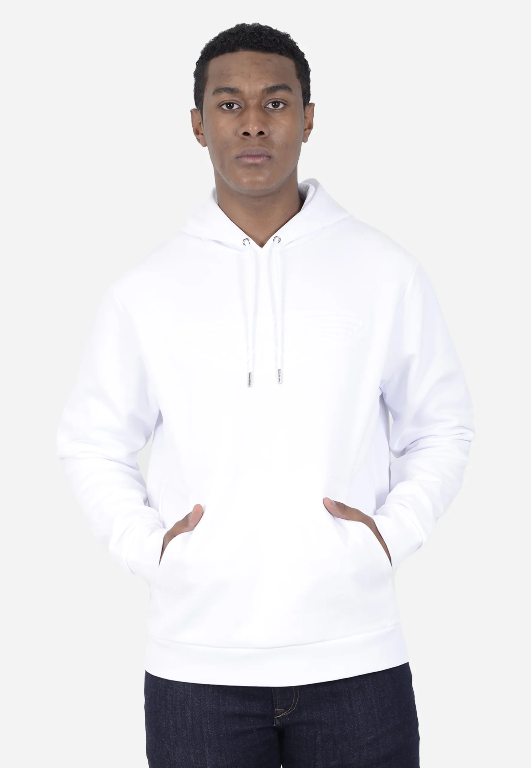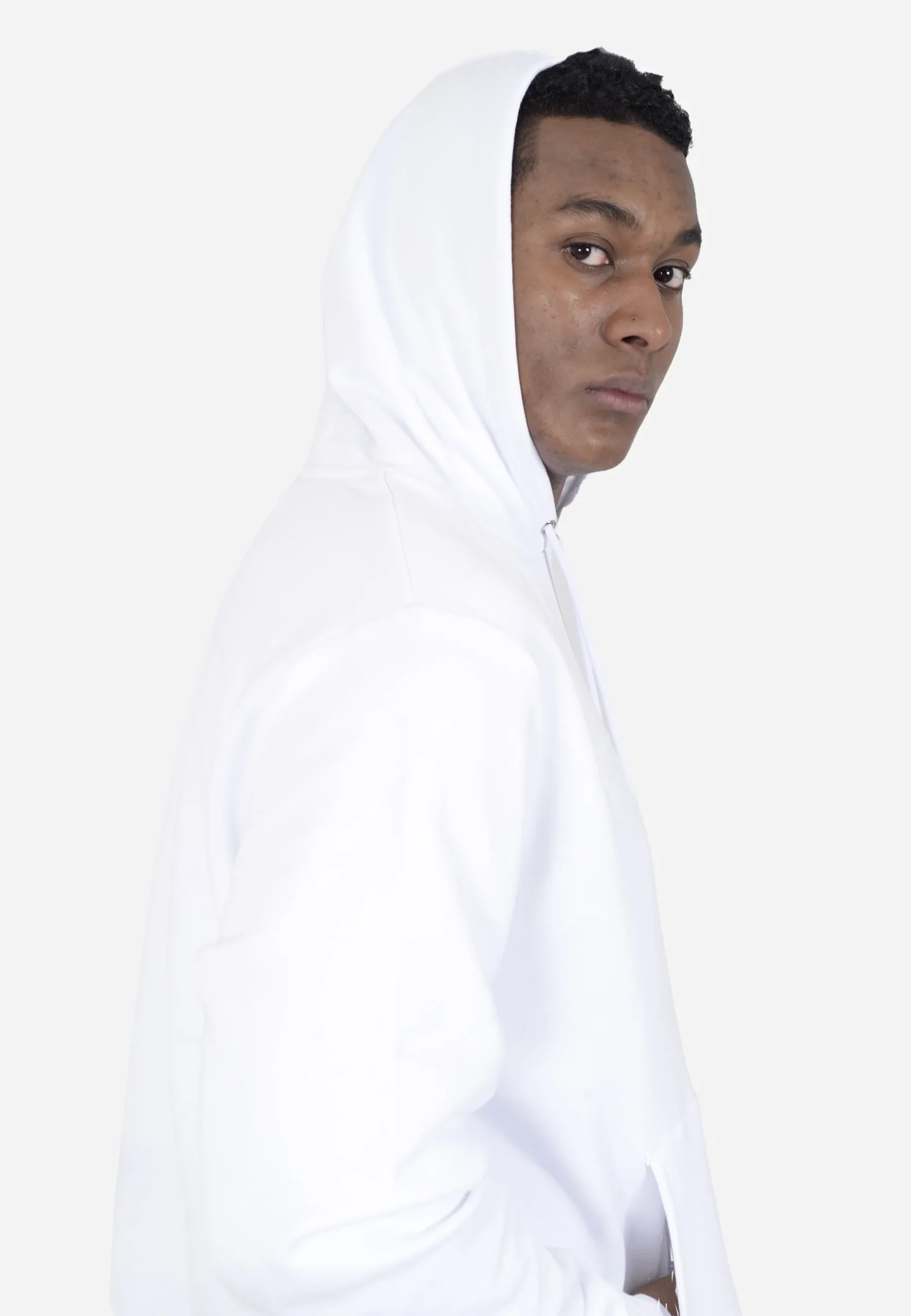 sudadera de hombre con capucha en color blanco, una prenda básica y versátil. Tiene un diseño de corte regular, con una capucha ajustable mediante cordones y un bolsillo tipo canguro en la parte frontal. Su estilo es casual y cómodo, ideal para el uso diario.