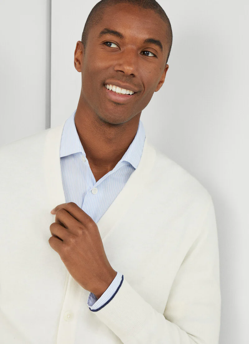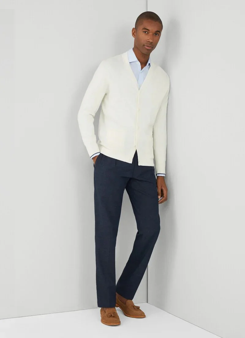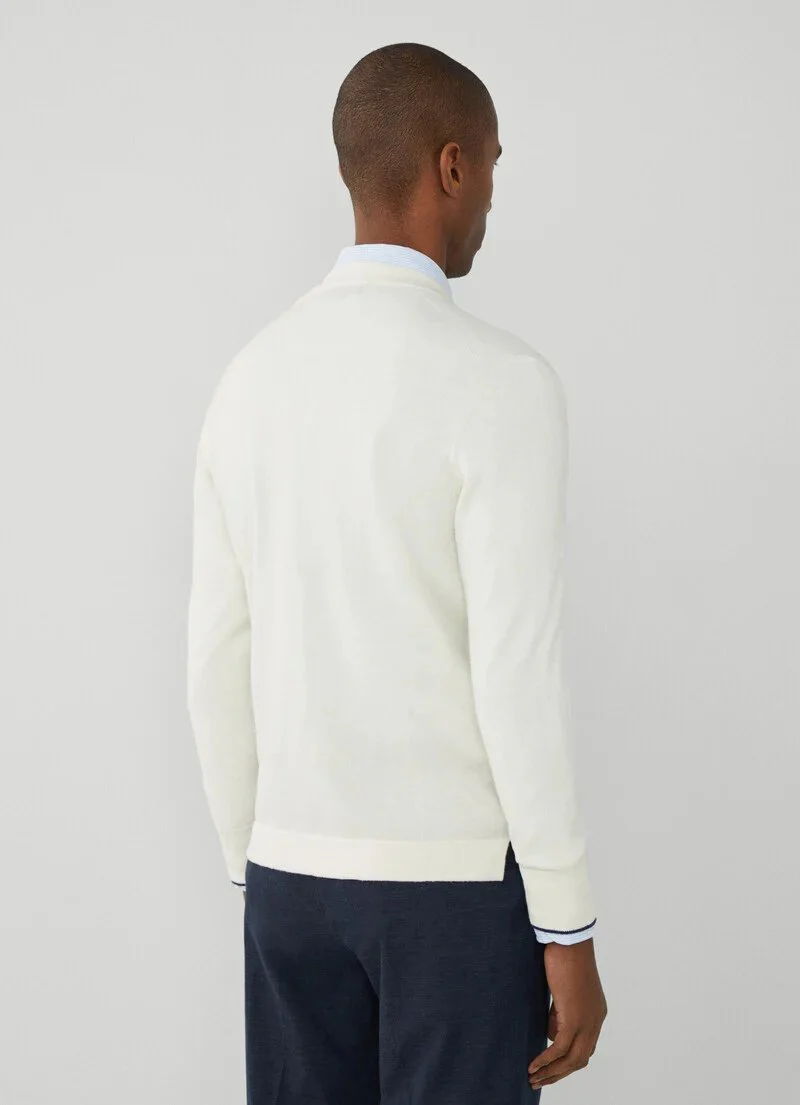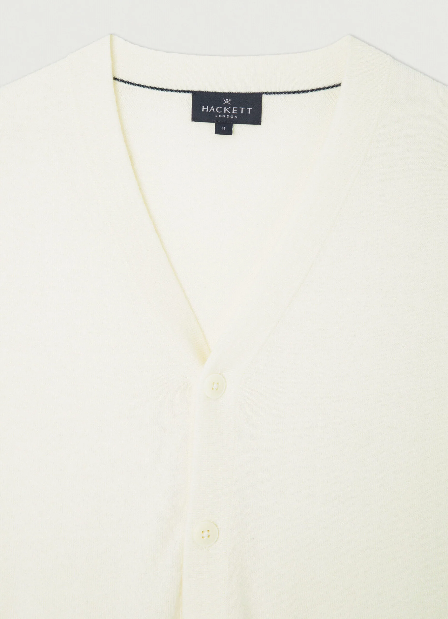 cárdigan de la marca Hackett London en un elegante color crema o blanco roto. Su diseño es minimalista, con un cuello en V y una botonera frontal. La prenda está confeccionada con un tejido suave, que puede ser lana o una mezcla de algodón, lo que la hace ideal para llevar sobre una camisa o camiseta. El estilo es versátil, ideal para un look casual, pero también sofisticado.