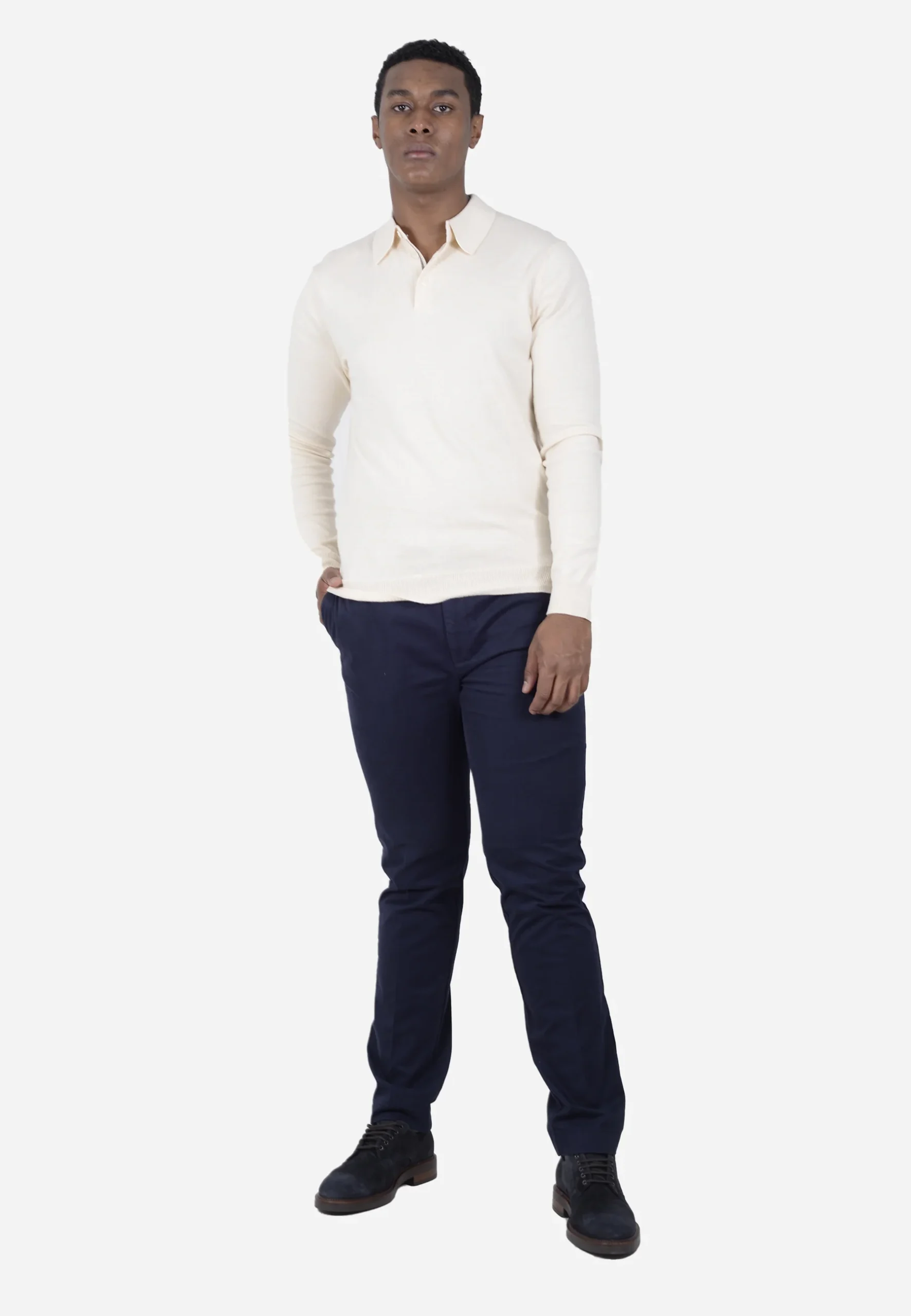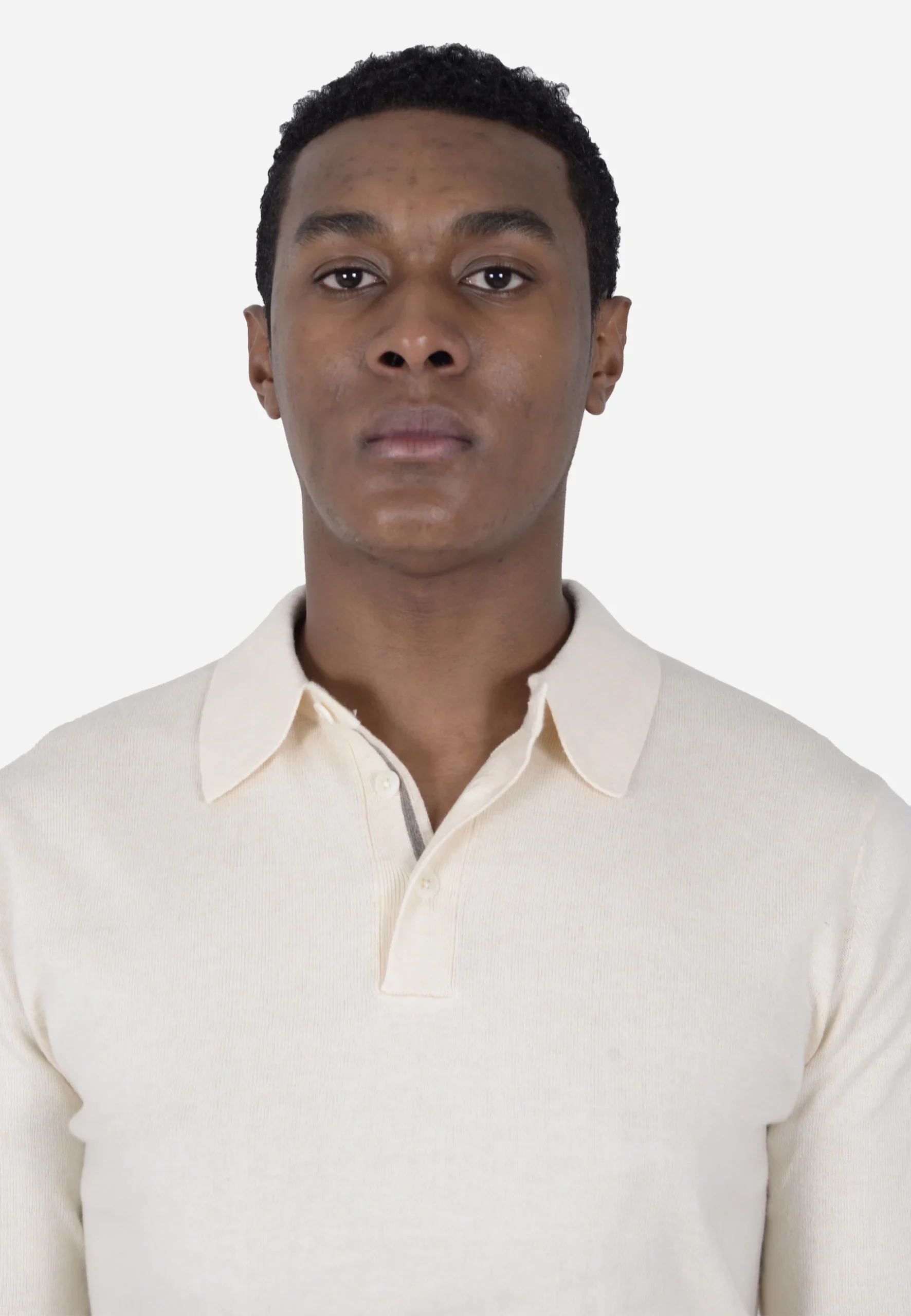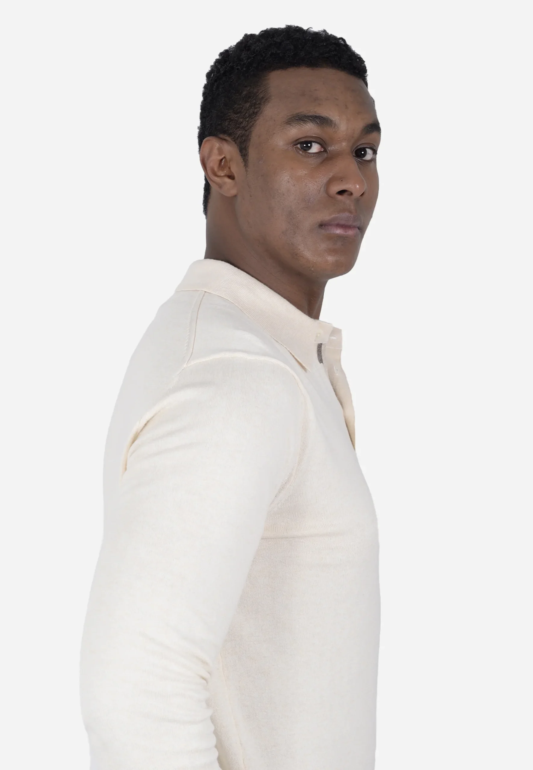 suéter de punto de manga larga para hombre, perfecto para combinar la calidez de un suéter con la elegancia de una camisa polo. El color hueso o crema lo hace muy versátil y fácil de combinar. El diseño de la prenda cuenta con un cuello de solapa y botones, que le da un toque clásico y refinado. Es una pieza clave para un look sofisticado en climas frescos.