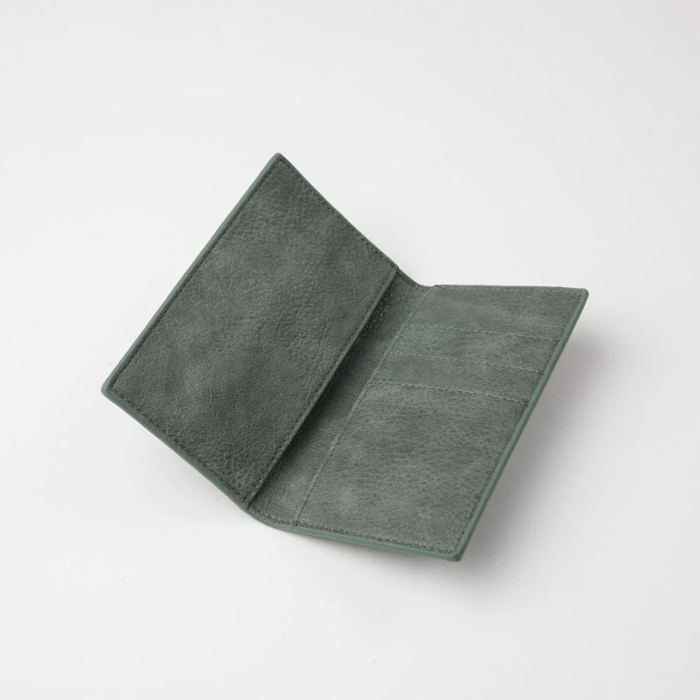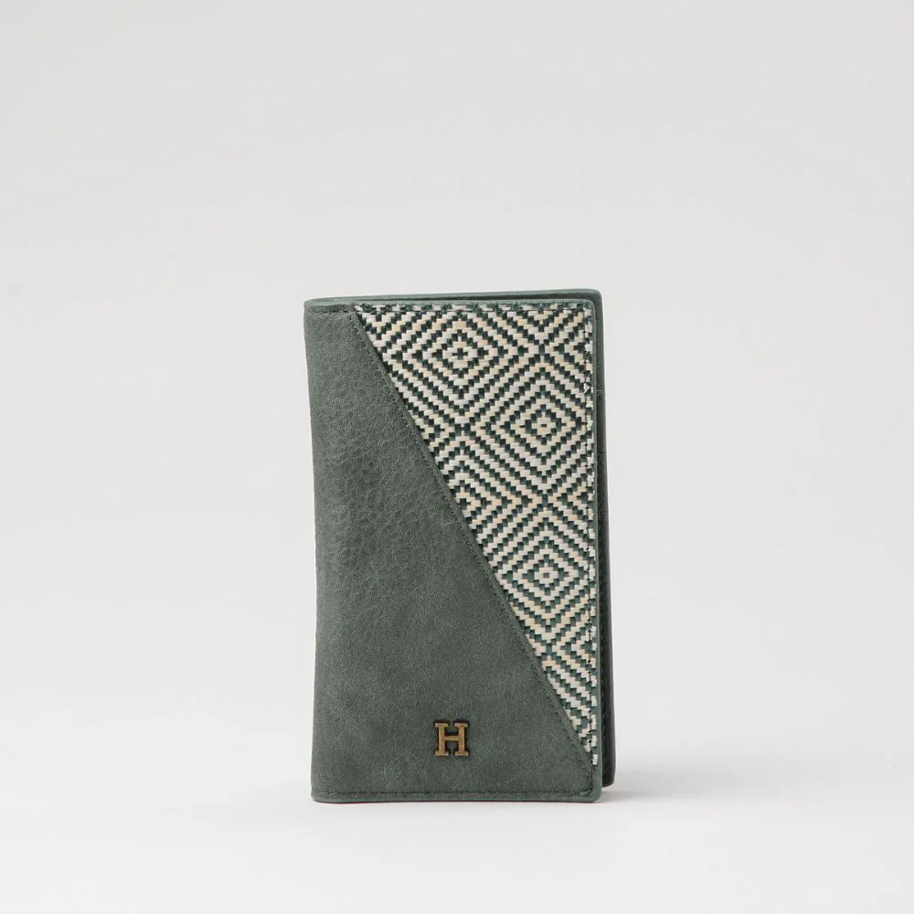 Tarjetero tipo libro diseño asimetrico ecocuero verde y rafia diseño rombo. Con espacio para tres tarjetas y dos espacios largos.