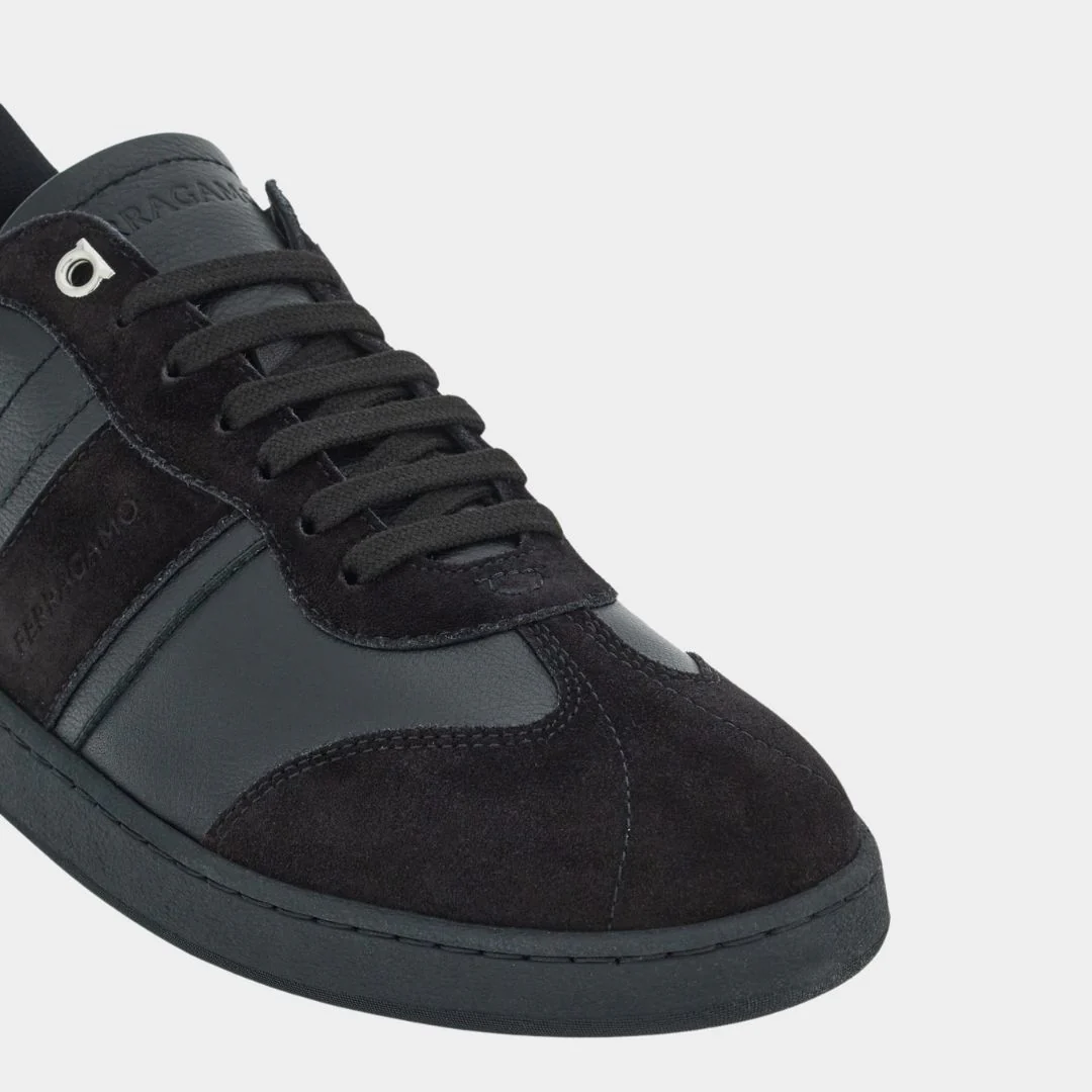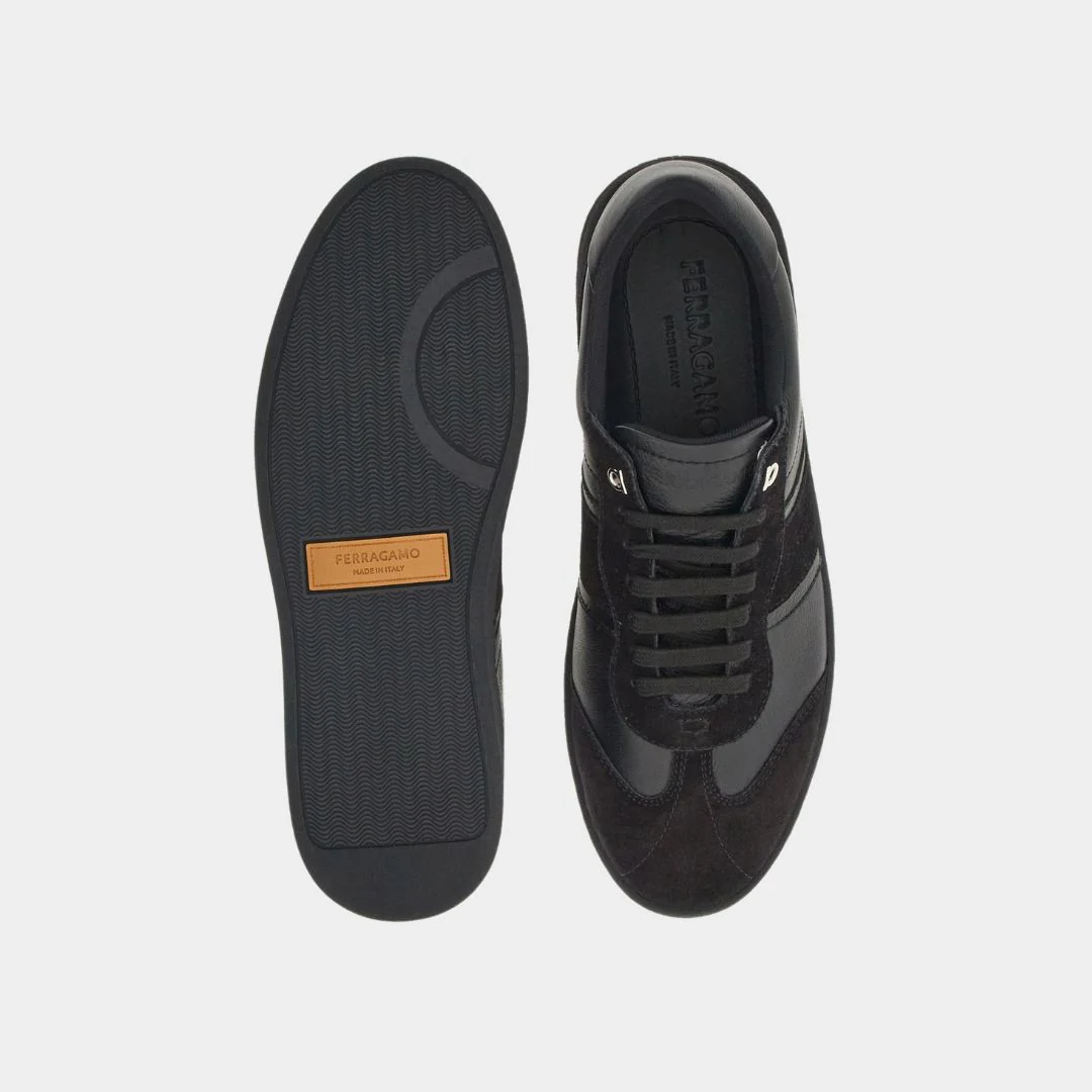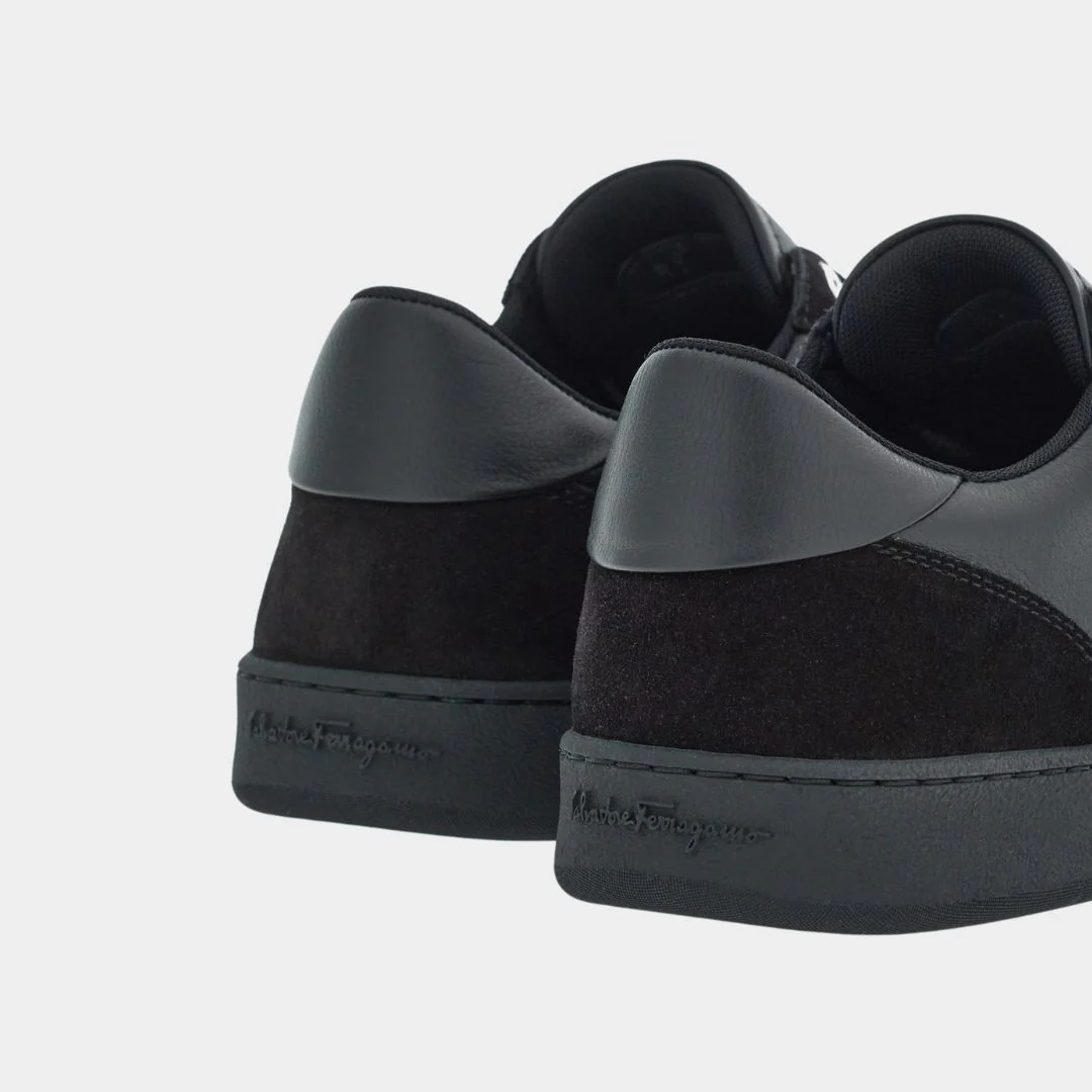 Los Tenis para hombre Achille 1 Low-Top en color Negro del diseñador Salvatore Ferragamo, Presentan un tacón plano, puntera redonda, cierre de cordones, logo grabado en la lengüeta y el lateral, y logo elevado en el talón. Confeccionados 100% cuero de alta calidad.