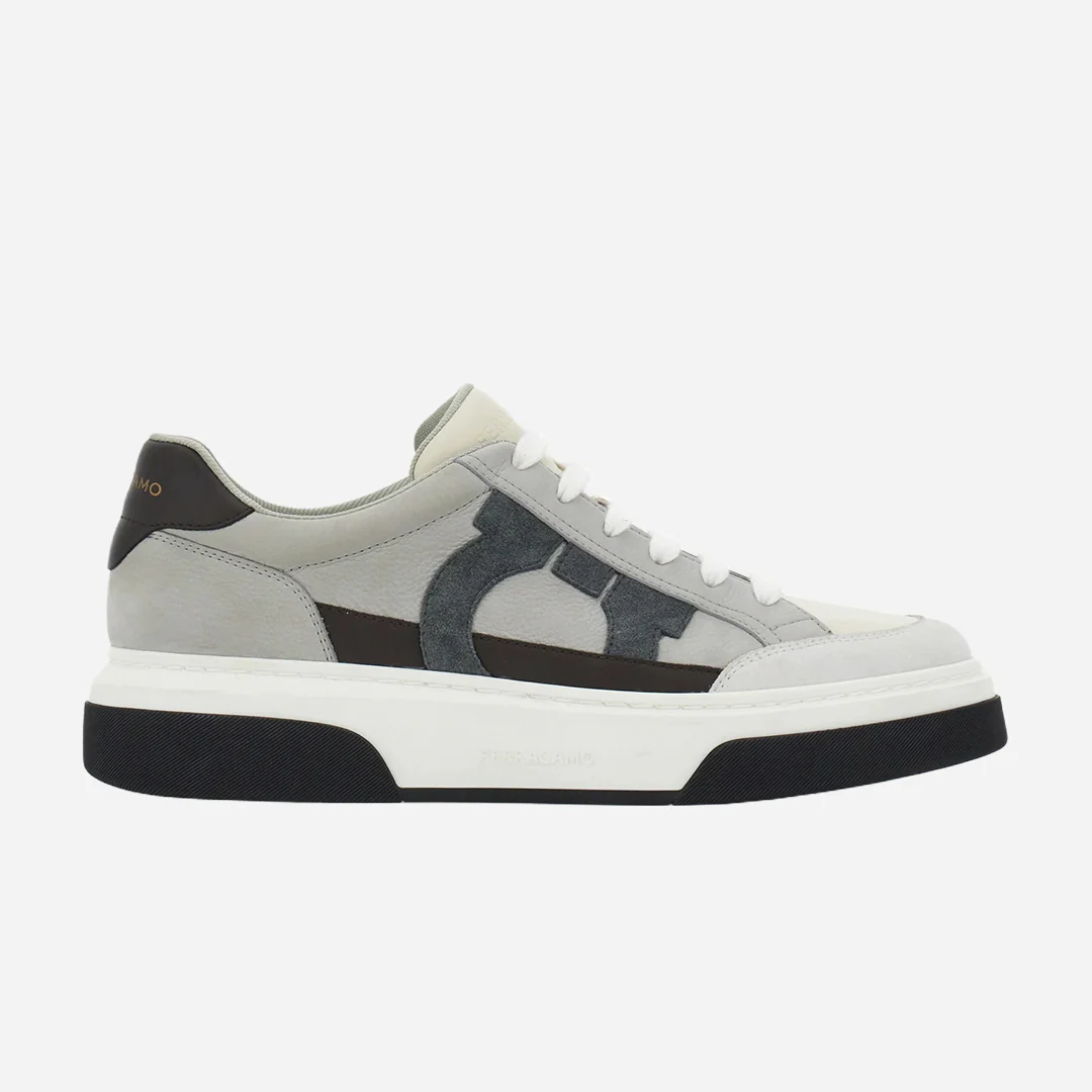 Sneakers bajas de piel con detalles de ante. Las líneas se inspiran en las zapatillas de baloncesto de los años 90, adornadas con una intarsia lateral con silueta Gancini. Suela de goma con bordes moleteados y piso personalizado.