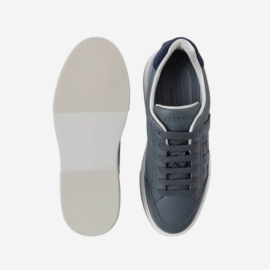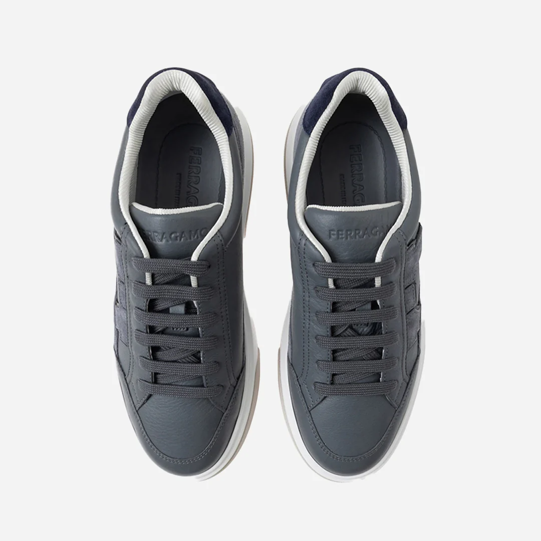 Sneakers bajas de piel con detalles de ante. Las líneas se inspiran en las zapatillas de baloncesto de los años 90, adornadas con una intarsia lateral con silueta Gancini. Suela de goma con bordes moleteados y piso personalizado.