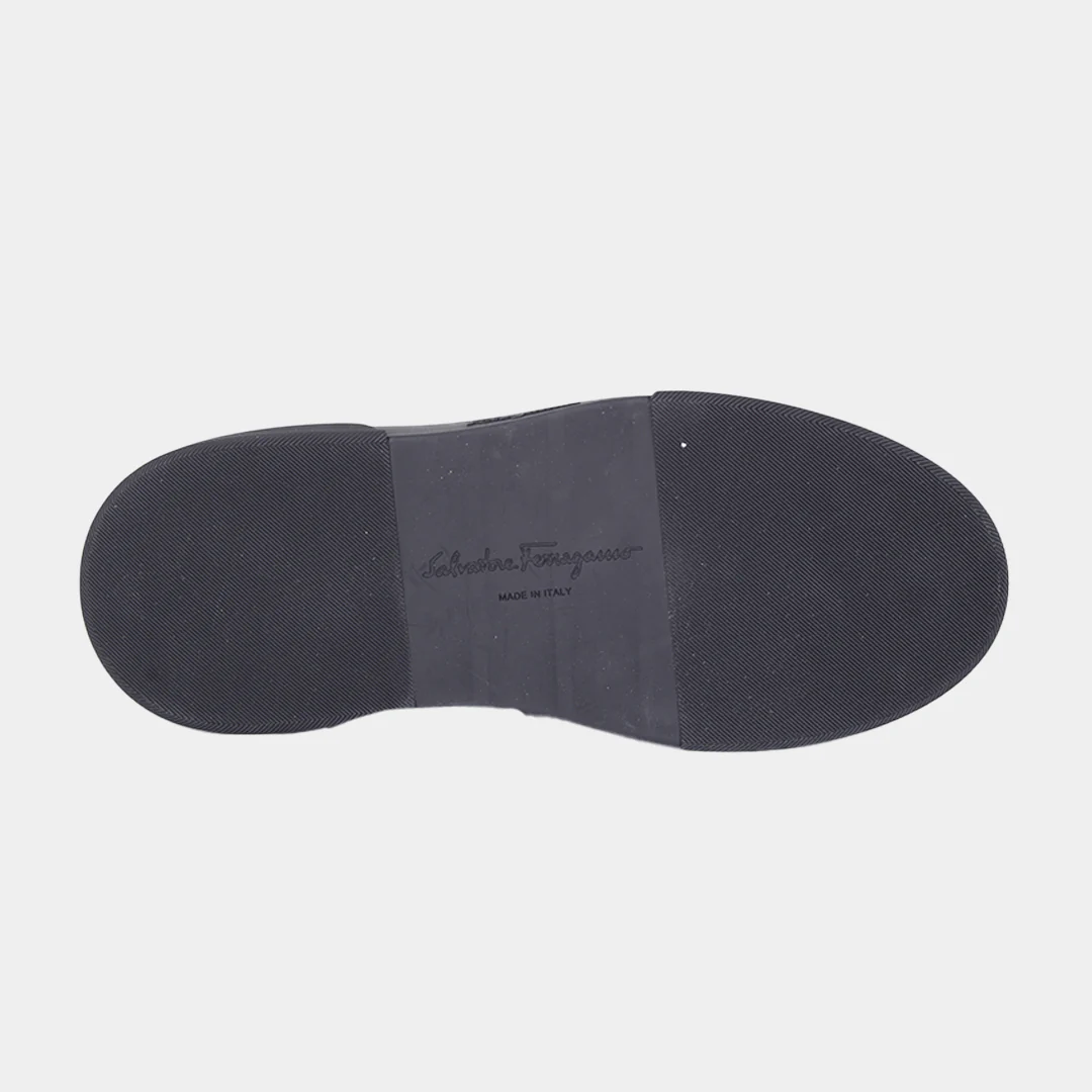 Los tenis para dama en cuero del diseñador Salvatore Ferragamo, es un modelo de corte bajo, con líneas limpias y un diseño que combina estilo deportivo y sofisticado, predominantemente de color negro con detalles en verde lima en la parte trasera del tobillo. Están elaborados en piel de alta calidad, con un diseño de suela gruesa y cordones negros, y presentan un acabado elegante y moderno. Adecuados para looks casuales y también para conjuntos más refinados, ofreciendo un toque distintivo.