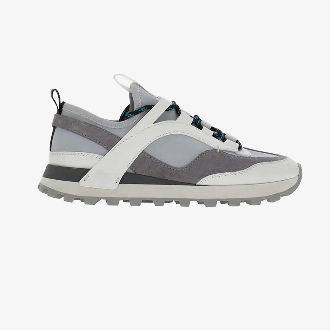 Sneakers bajas con empeine de malla técnica, ante y piel. Las líneas se inspiran en las zapatillas de baloncesto de los años 90, adornadas con una intarsia lateral con silueta Gancini. Suela de goma con bordes moleteados y piso personalizado.