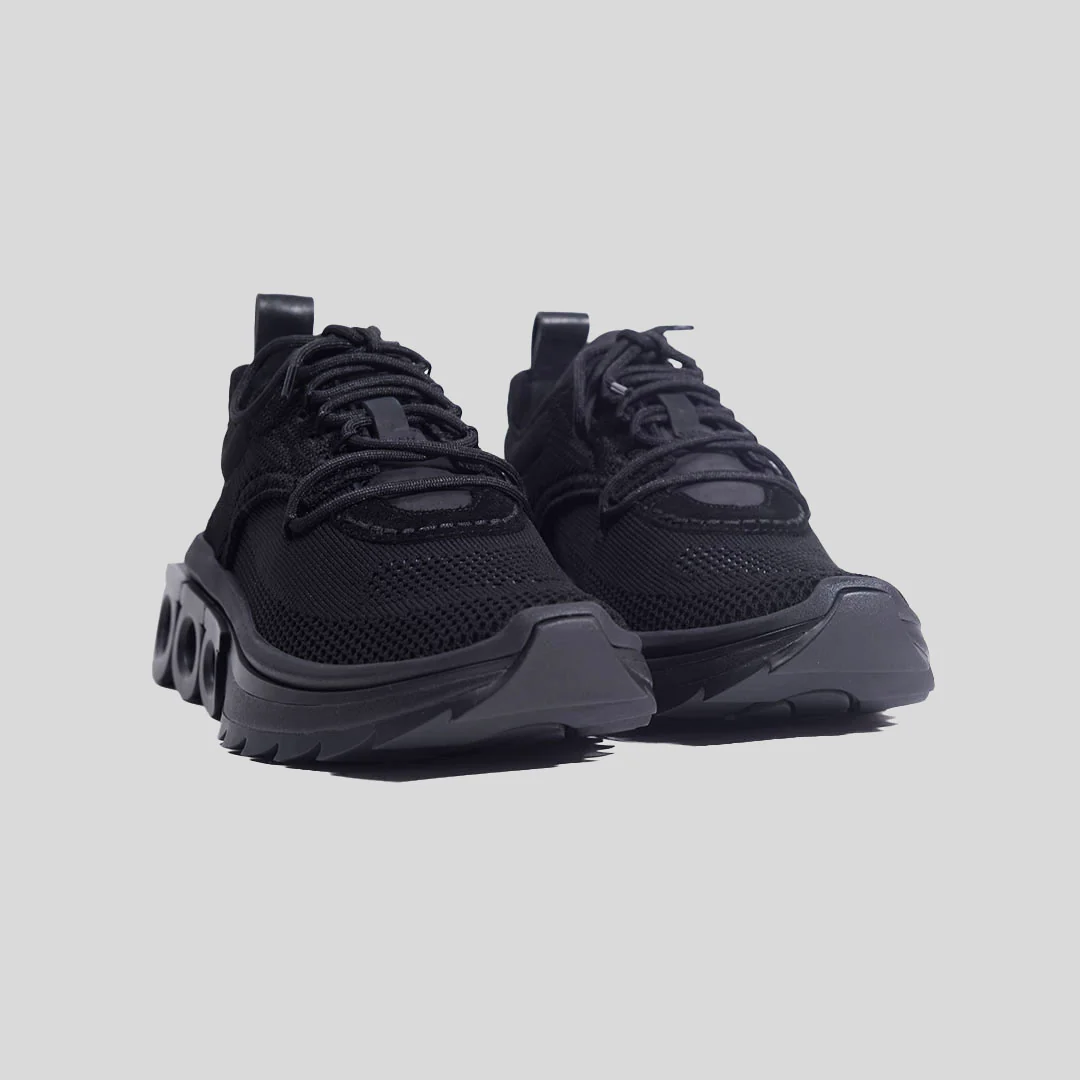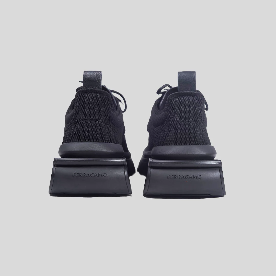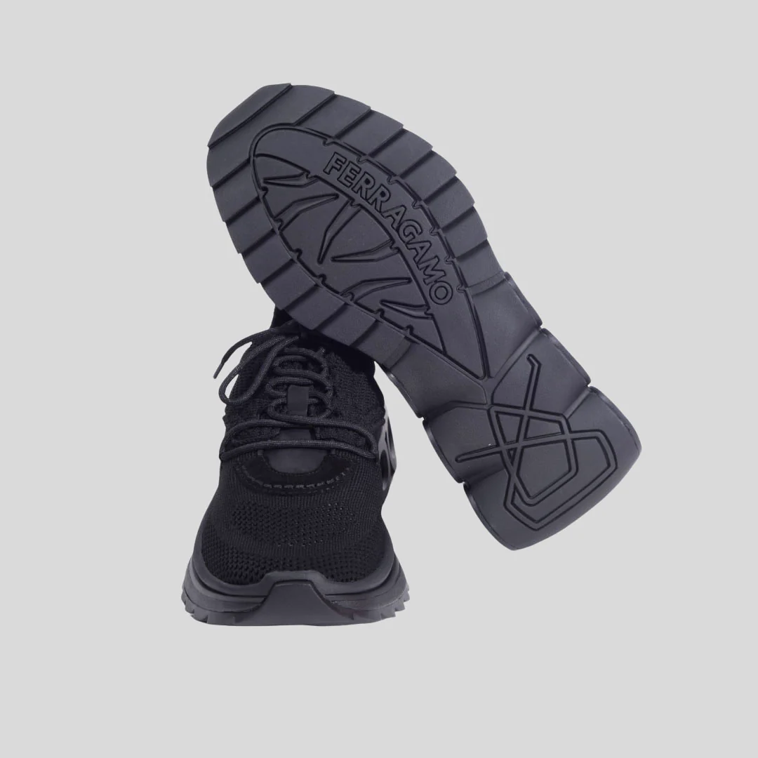 Parte superior de punto, placa Gancini, logo en relieve en la lengüeta, logo en el contrafuerte, logo en la suela, diseño de paneles, lengüeta en la parte posterior, cierre con cordones en la parte delantera, puntera redonda, suela plana de goma y plantilla con logo.