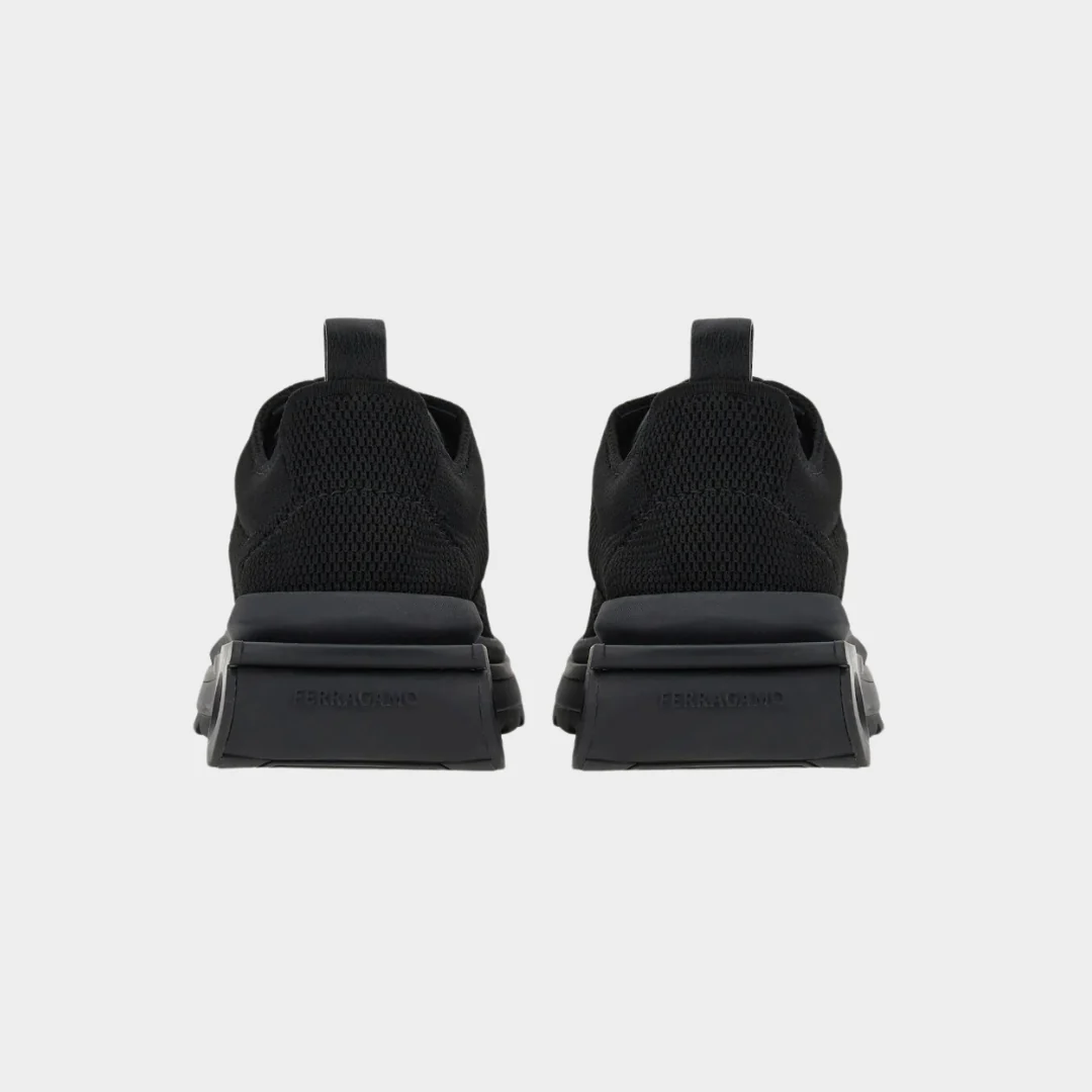 Tennis deportivos en color negro con diseño moderno y futurista. Confeccionados en malla técnica de punto flexible y transpirable, ofrecen un ajuste tipo calcetín que brinda comodidad durante todo el día. Incorporan cierre con agujetas y tiradores en talón y lengüeta para un calce práctico. La suela de goma, de alto impacto visual, destaca por sus aberturas circulares que aportan ligereza, amortiguación y un estilo innovador.